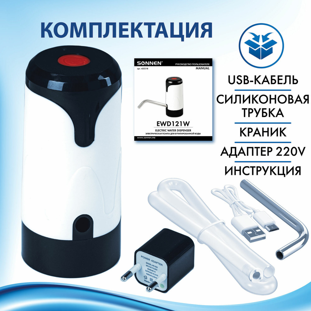 Sonnen Помпа для воды электрическаяВ данный момент этот товар отсутствует в продаже. Возможно, у нас найдется аналогичный или похожий товар здесь. Помпа для воды EWD121W — электрическое приспособление мощностью 5 Вт, предназначенное для розлива воды из больших бутылей на 11 и 19 л. Для удобства использования не нужно снимать крышку с горлышка бутыли, помпа устанавливается прямо на крышку. |