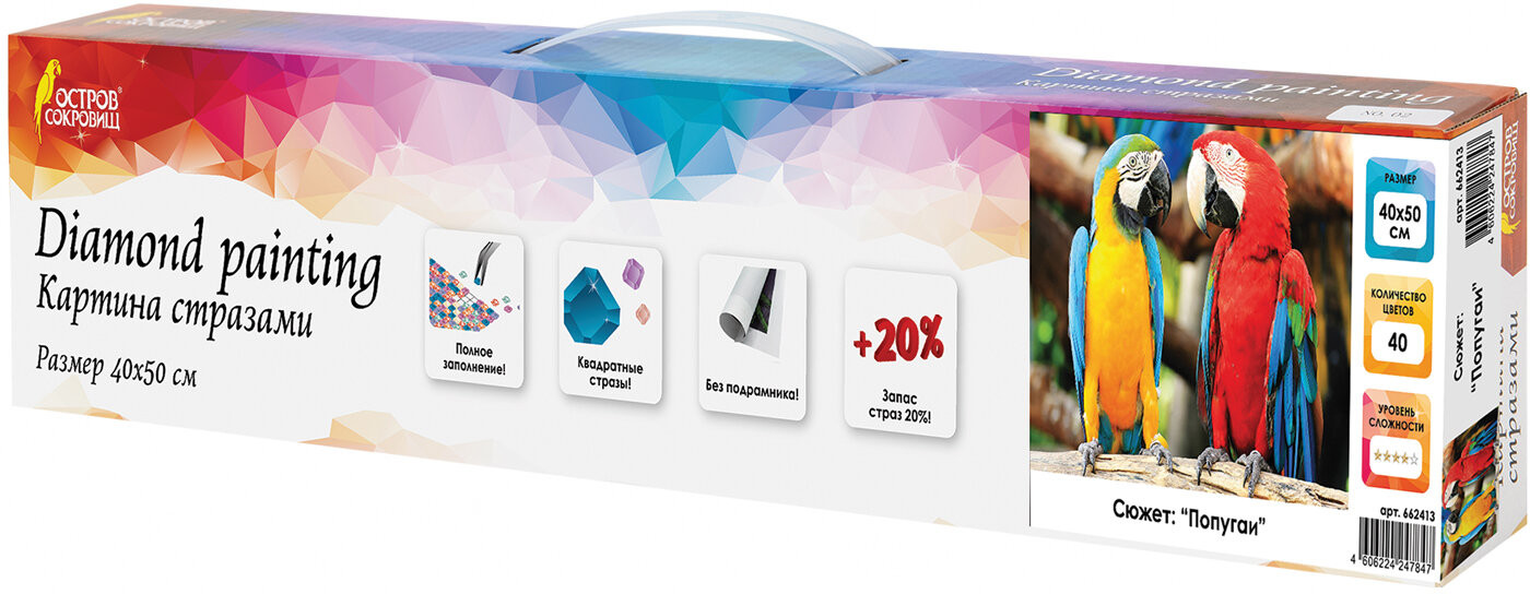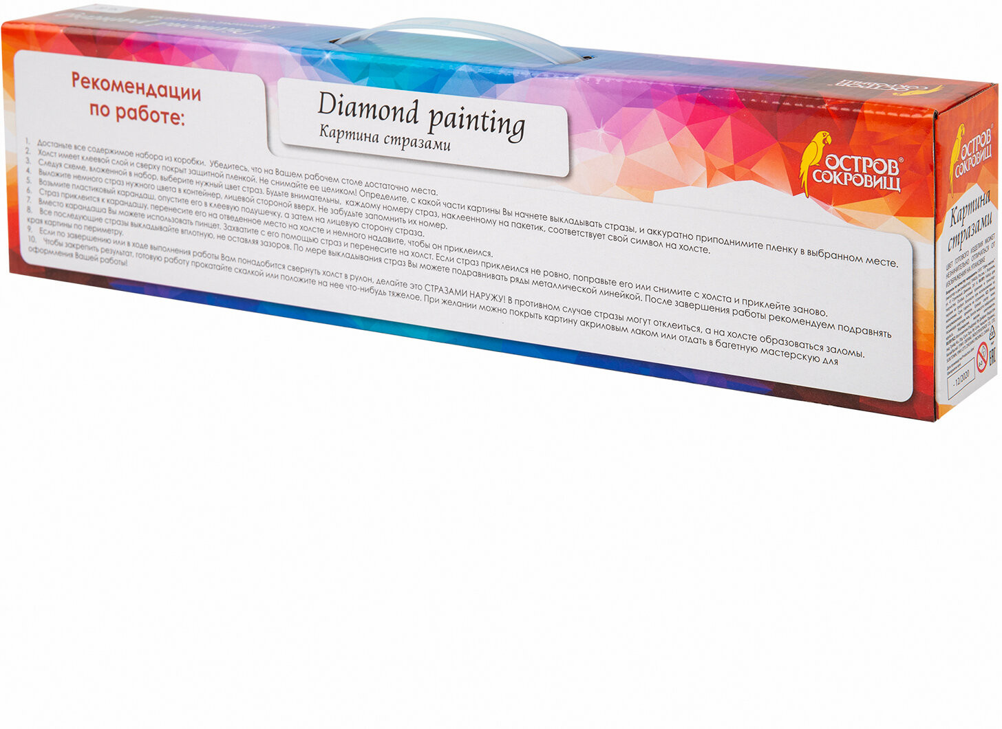Размер готовой картины составляет 40×50 см. Картина полностью заполняется квадратными акриловыми стразами, благодаря чему готовая работа блистает и переливается на свету. Алмазная мозаика — прекрасное хобби, подходящее для терпеливых людей, ценящих красоту. Картины стразами «Остров сокровищ» — это широкий выбор сюжетов, отличный подарок, как в виде набора, так и в качестве готовой работы, которая послужит эффектным украшением любого интерьера!