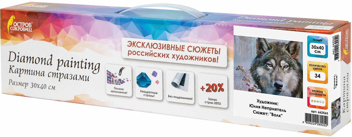 Размер готовой картины составляет 30×40 см. Картина полностью заполняется квадратными акриловыми стразами, благодаря чему готовая работа блистает и переливается на свету. Алмазная мозаика — прекрасное хобби, подходящее для терпеливых людей, ценящих красоту. Картины стразами «Остров сокровищ» — это широкий выбор сюжетов, отличный подарок, как в виде набора, так и в качестве готовой работы, которая послужит эффектным украшением любого интерьера!