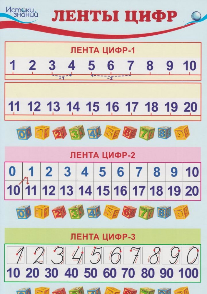 Наглядное пособие «Лента цифр» поможет ознакомить детей с цифрами и арифметическими действиями сложения и вычитания. На плакате дано три варианта лент — от 1 до 20 (счет до 20), от 0 до 20 (получение цифр второго десятка), от 10 до 100 (с рукописным написанием цифр). Каждый вариант можно использовать отдельно, разрезав плакат.