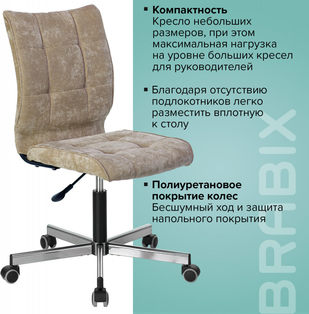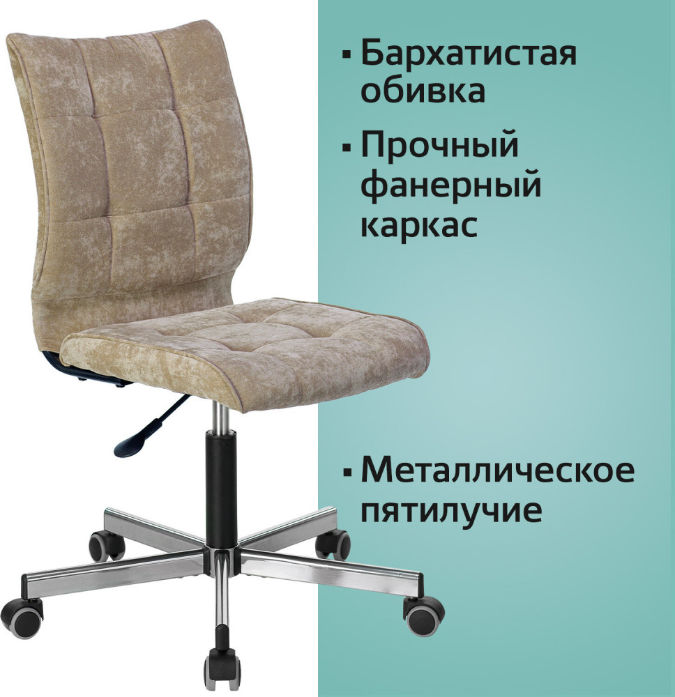 Модель идеально подходит для домашнего офиса, а также впишется в интерьер любых предприятий сферы обслуживания: салонов, агентств, студий и т.п. Каркас сиденья и спинки выполнен из фанеры. Материал обивки — приятная на ощупь, бархатистая мебельная ткань. Чехол со стежкой формирует презентабельный внешний вид и эргономику, не съемный.