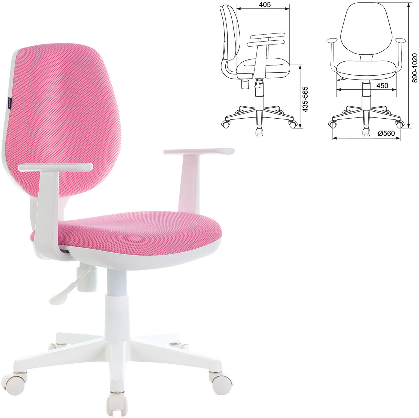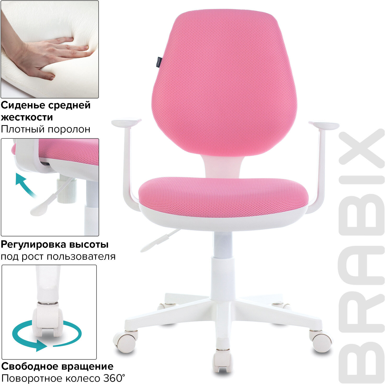 Крестовина кресла максимально увеличивает площадь основания и почти исключает возможность опрокидывания. Газлифт выдерживает и ребенка, и взрослого весом до 120 кг. Подлокотники и пятилучие — пластиковые белого цвета. Спинка и сиденье имеют плотную набивку, средней жесткости. Компактная модель, которая легко выдерживает нагрузку взрослого человека.