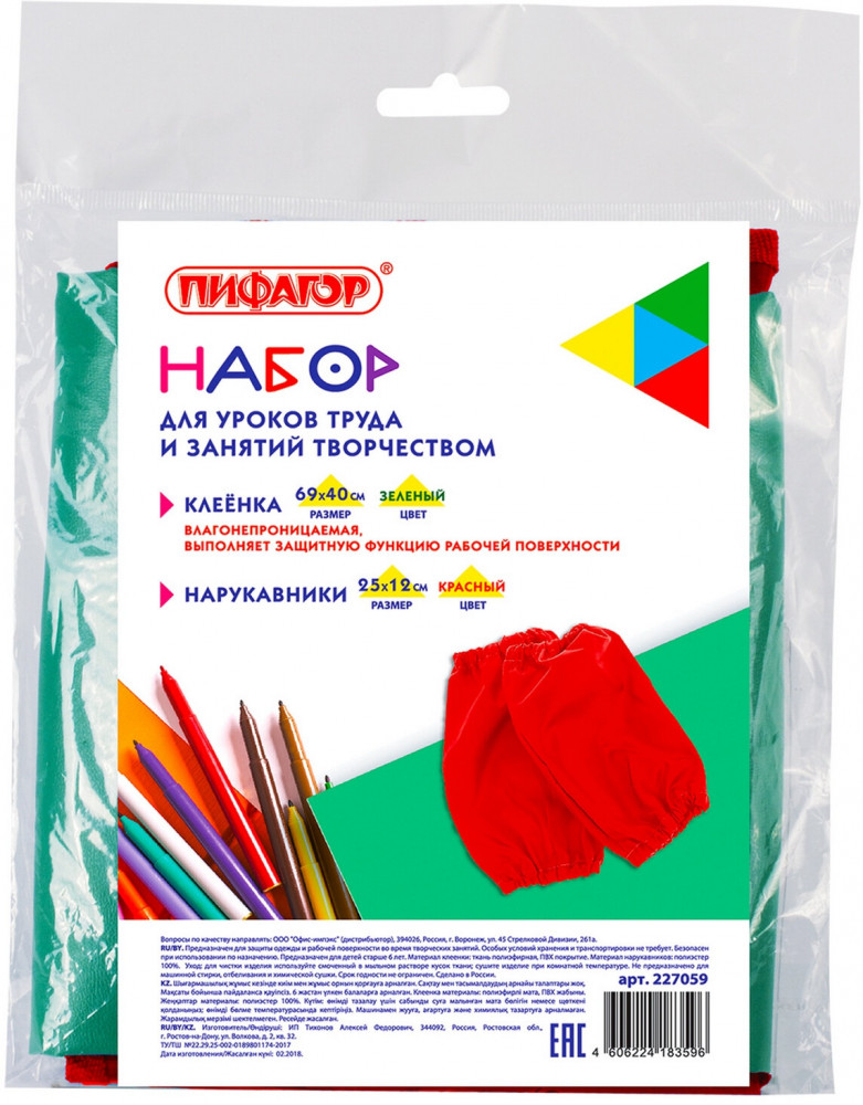 Пифагор Набор для уроков труда и занятий творчествомВ данный момент этот товар отсутствует в продаже. Возможно, у нас найдется аналогичный или похожий товар здесь. Набор для уроков труда — незаменимая вещь для защиты одежды и рабочей поверхности на уроках труда и занятиях творчеством. В набор входит клеёнка и нарукавники. Предусмотрен для многоразового использования. Нарукавники изготовлены из водоотталкивающего материала, клеёнка — из ПВХ. |