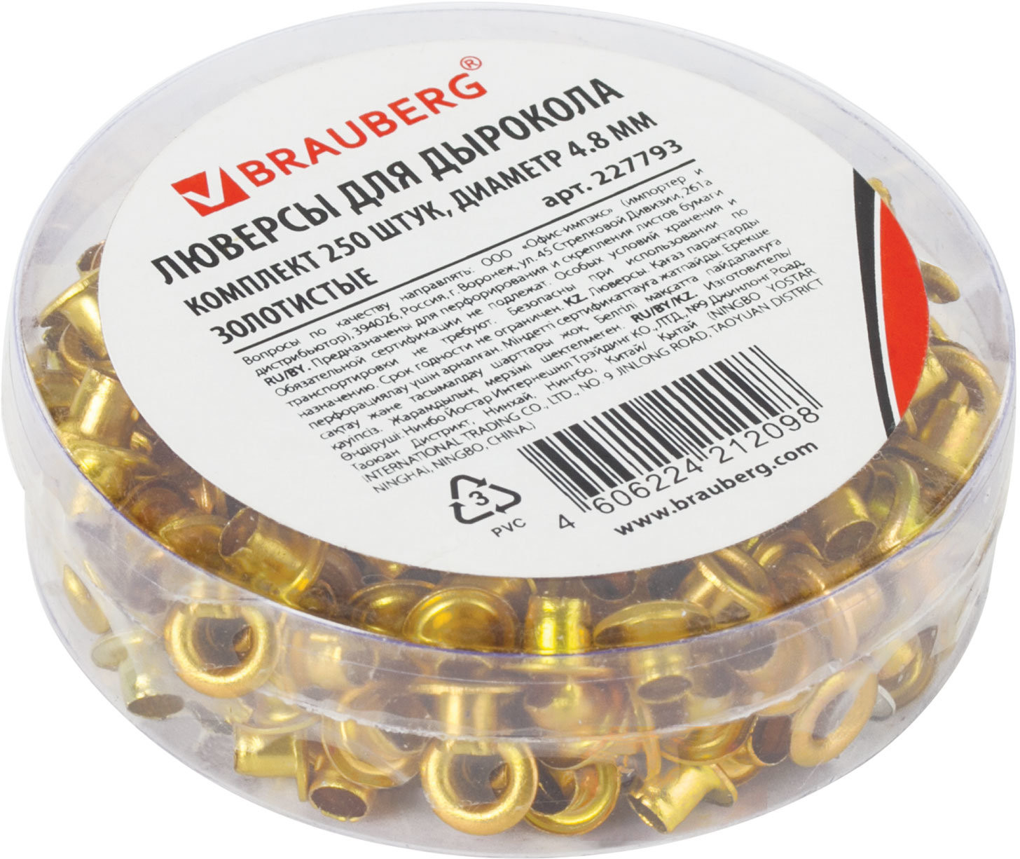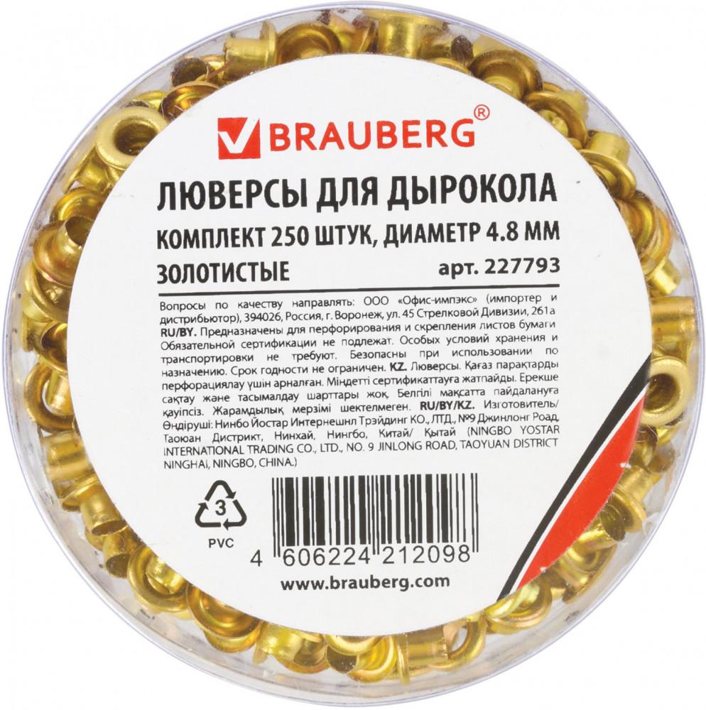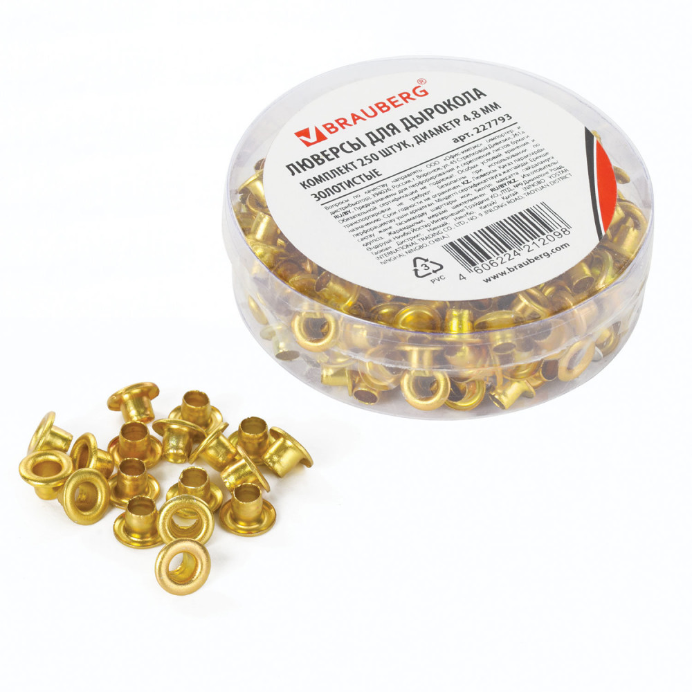 Люверсы Brauberg предназначены для защиты отверстий от механического повреждения (разрыва, износа) при сшивании бумаги, картона, баннерной ткани. Крепятся с помощью дырокола. Также подходят для скрапбукинга. Изготовлены из металла золотистого цвета. Длина — 4,6 мм, внутренний диаметр 4,8 мм. 250 штук в комплекте. Поставляются в пластиковом цилиндре.