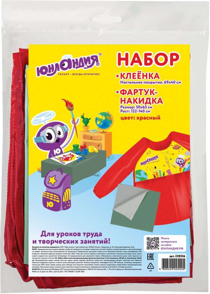 💳 Оплатить за товар можно при получении 🇰🇿 Есть бесплатная доставка по Казахстану от 1 дня 🎁 Копите бонусы с каждой покупки Набор для уроков труда — незаменимая вещь для защиты одежды и рабочей поверхности на уроках труда и занятиях творчеством. Фартук-накидка с рукавами изготовлен из водоотталкивающего материала, который защитит одежду от загрязнений в процессе занятий. Застегивается сзади на липучку — быстро и удобно. В наборе имеется клеенка для защиты рабочей поверхности. Материал клеенки — ПВХ. Набор предусмотрен для многоразового использования. |