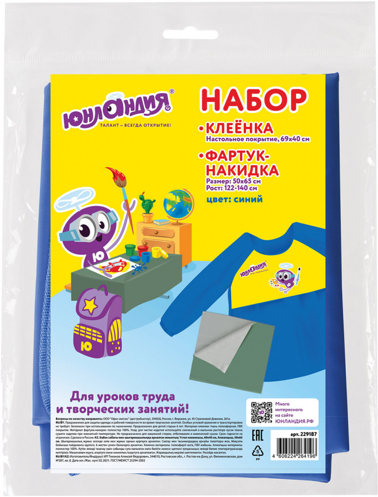 Юнландия Набор для уроков труда и занятий творчествомВ данный момент этот товар отсутствует в продаже. Возможно, у нас найдется аналогичный или похожий товар здесь. Набор для уроков труда — незаменимая вещь для защиты одежды и рабочей поверхности на уроках труда и занятиях творчеством. Фартук-накидка с рукавами изготовлен из водоотталкивающего материала, который защитит одежду от загрязнений в процессе занятий. Застегивается сзади на липучку — быстро и удобно. В наборе имеется клеенка для защиты рабочей поверхности. Материал клеенки — ПВХ. Набор предусмотрен для многоразового использования. |