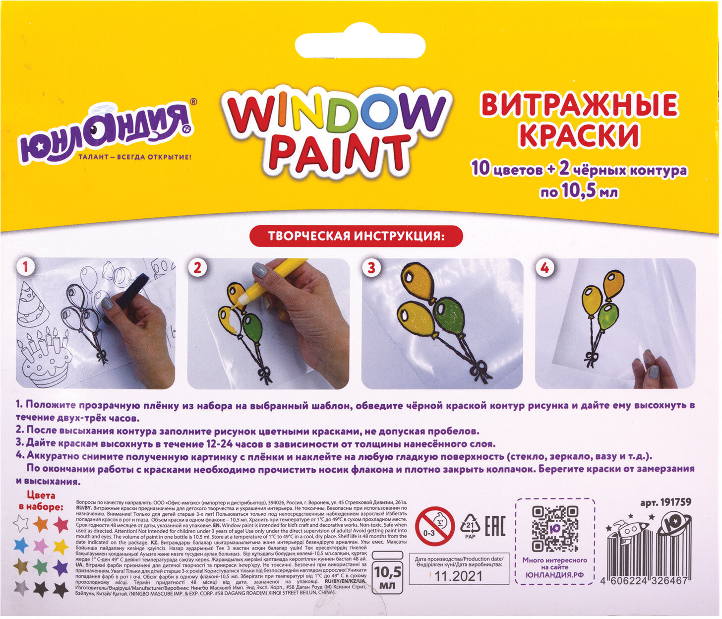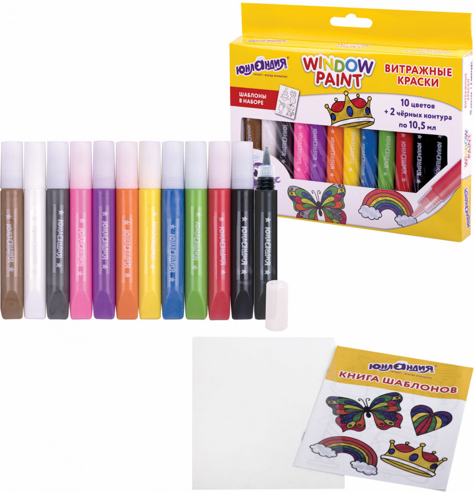 Витражные краски «Юнландия» предназначены для украшения окон, зеркал и других гладких поверхностей яркими аппликациями. Могут быть использованы для декорирования и росписи изделий, изготовления наклеек.