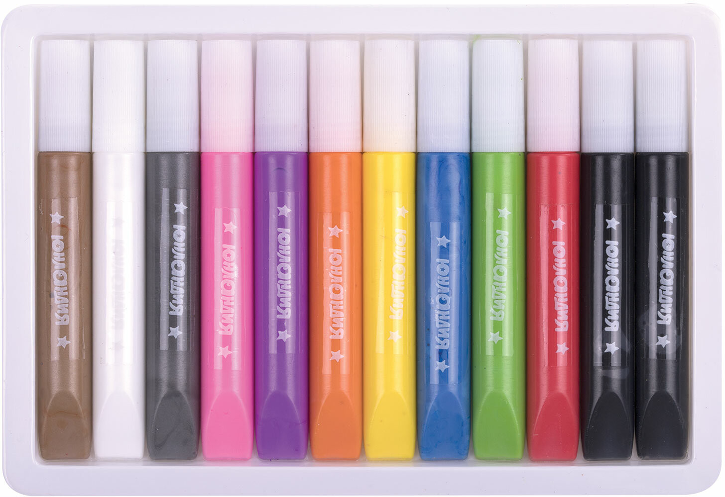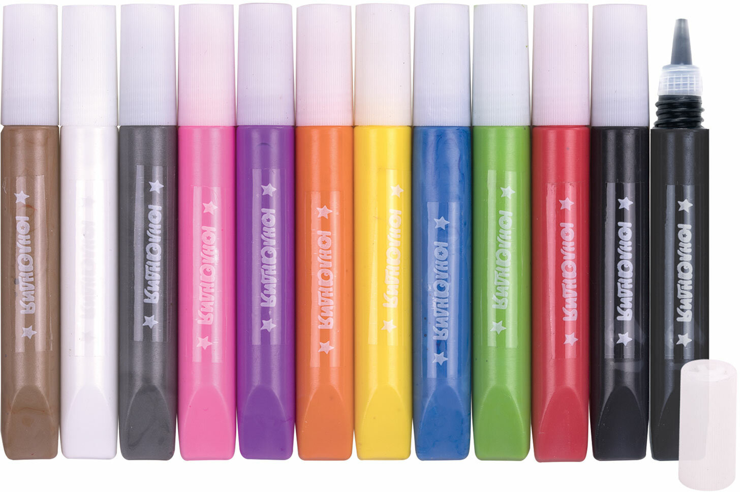 В наборе: 12 ярких непрозрачных красок в 11 цветах (красный, синий, зеленый, желтый, черный, оранжевый, фиолетовый, розовый, белый, золотой, серебристый) в тубах по 10,5 мл, книга с шаблонами для рисования и пленка для предварительного создания аппликаций из красок. В наборе 2 тубы с краской черного цвета для создания черного контура. |