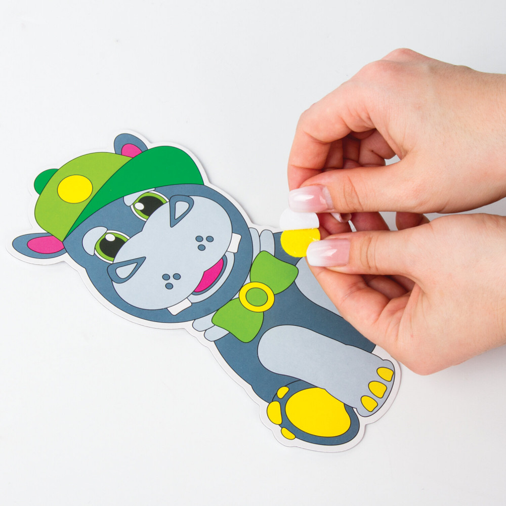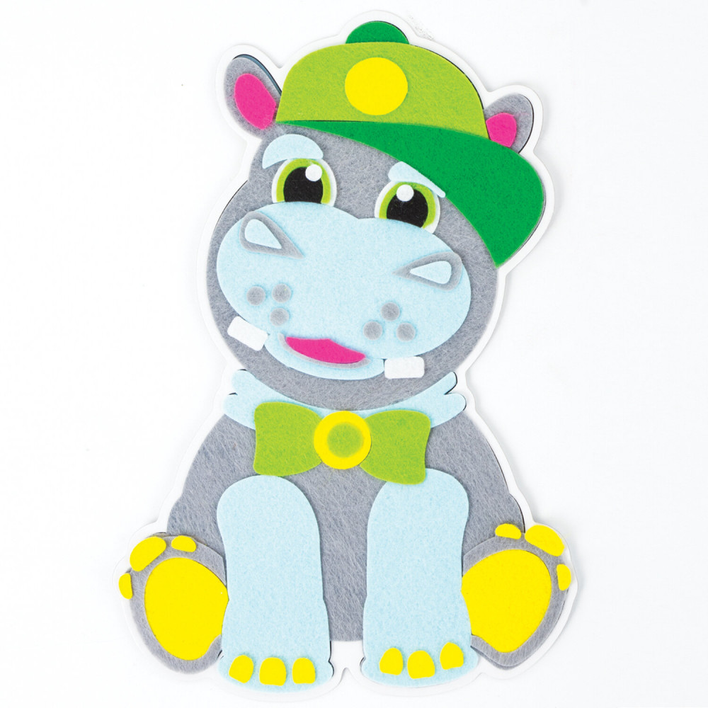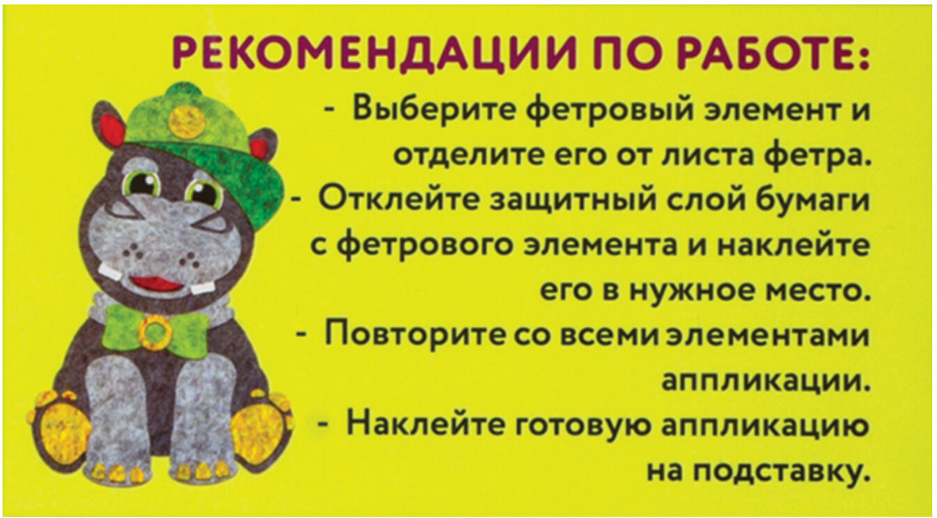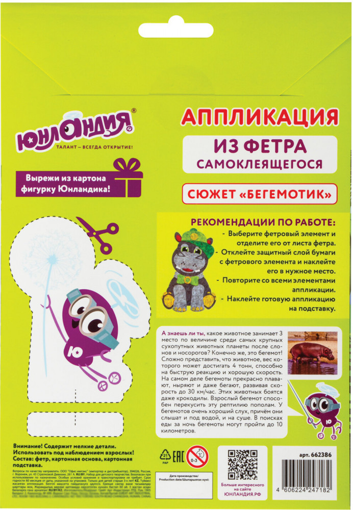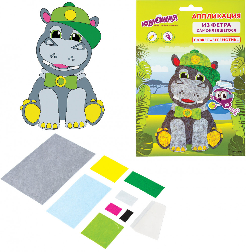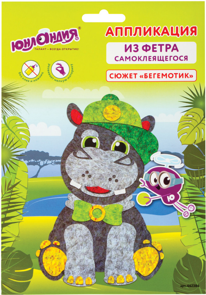 Аппликация из фетра — это весёлый и занимательный способ развития мелкой моторики, аккуратности и фантазии ребёнка. Все элементы в составе самоклеящиеся, для работы не требуются ножницы и клей. В набор входит яркая картонная основа в форме бегемотика размером не более 20×15 см с напечатанным дизайном аппликации, разработанным дизайнерами «Юнландия» специально для детей, а также 8 листов фетра разных цветов. Фетровые элементы аппликации перфорированы и имеют клеевой слой, что позволяет создать аппликацию без клея и ножниц. Также в набор входит картонная подставка с клеевым слоем, на которую можно установить готовую аппликацию.