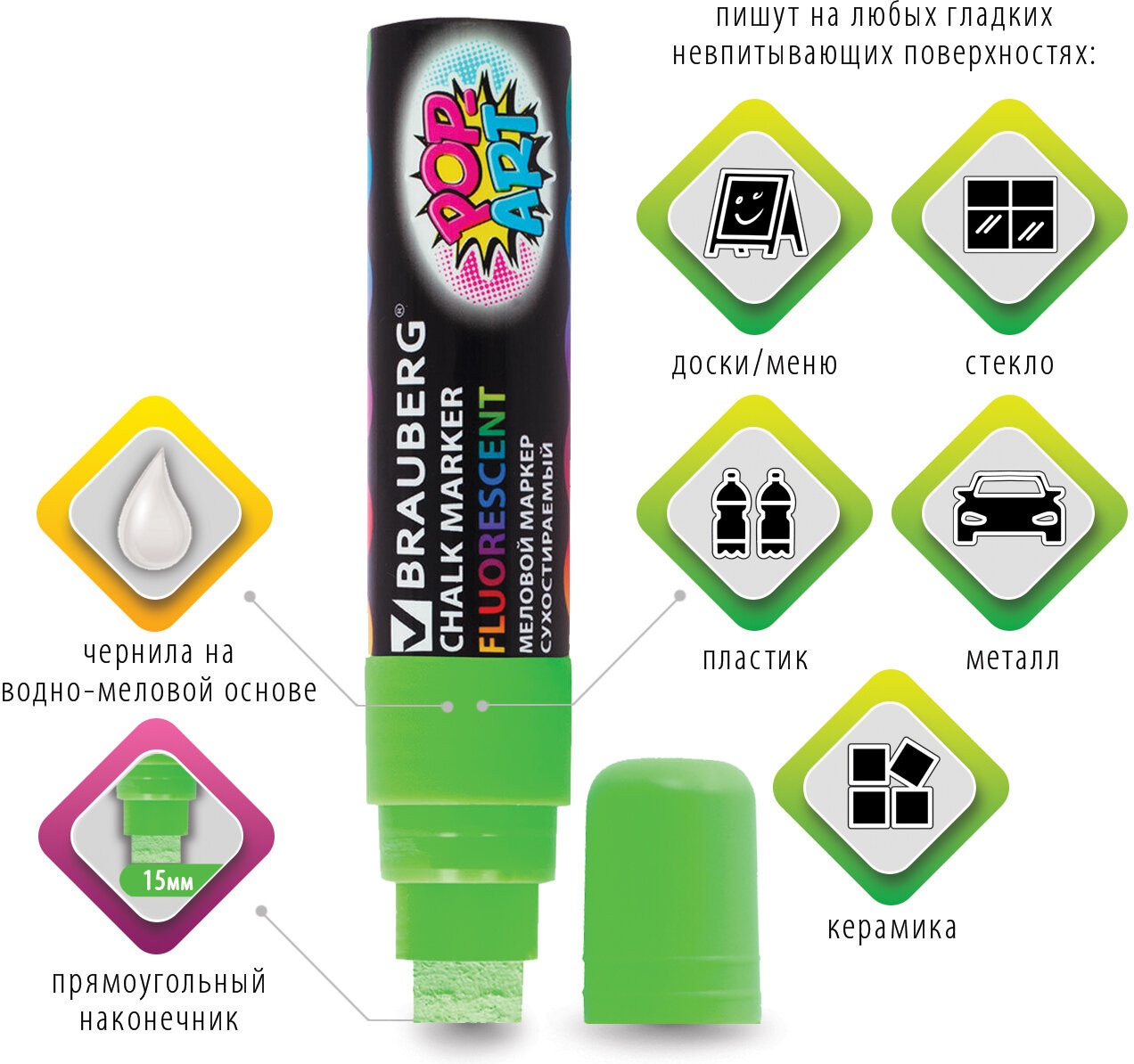 Хорошо рисует на стекле, цвет чёткий. Стирается влажной тряпкой за несколько подходов