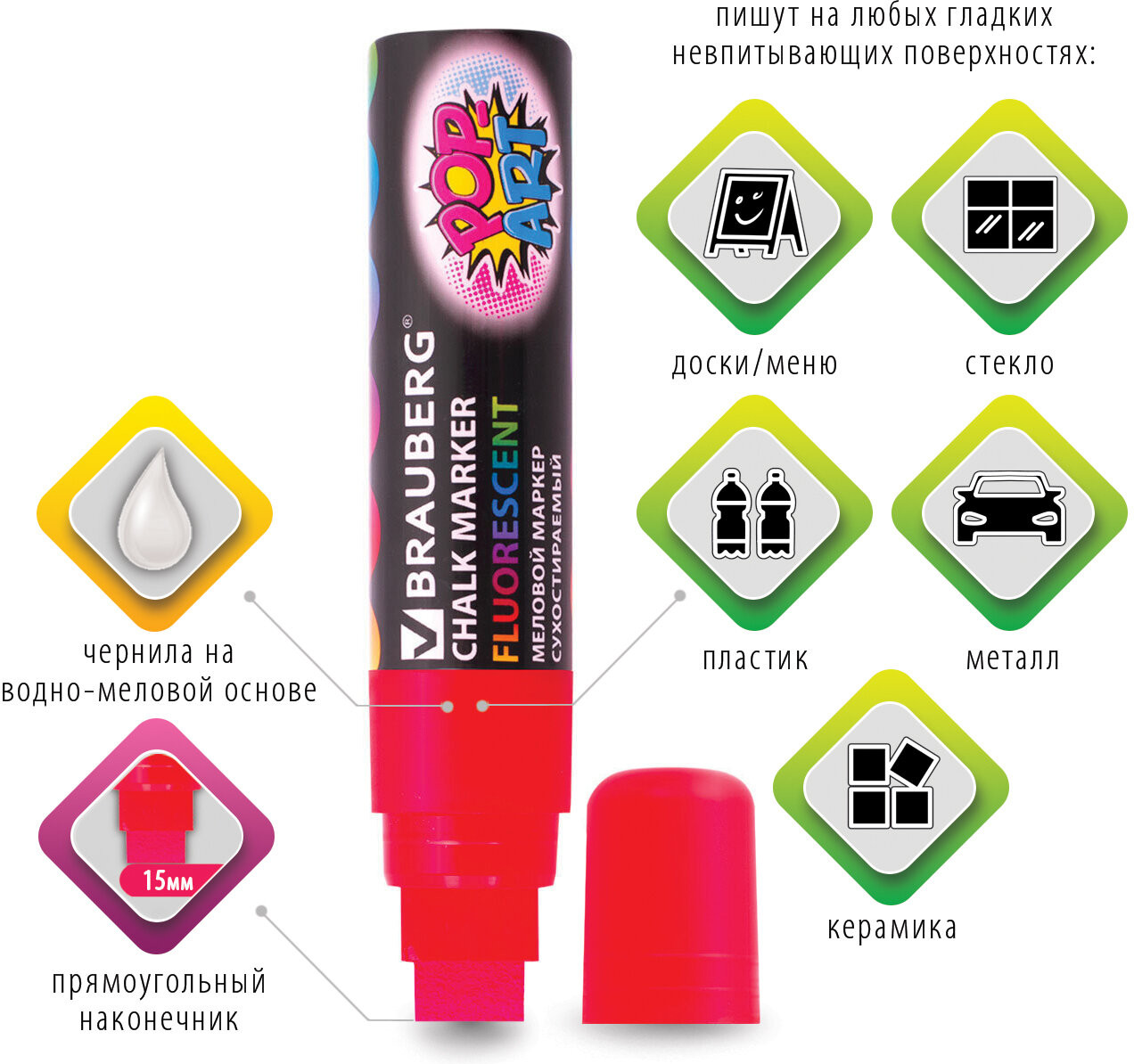 Хорошо рисует на стекле, цвет чёткий. Стирается влажной тряпкой за несколько подходов