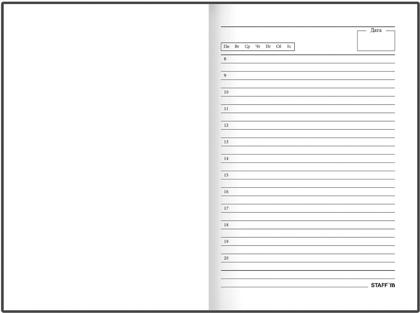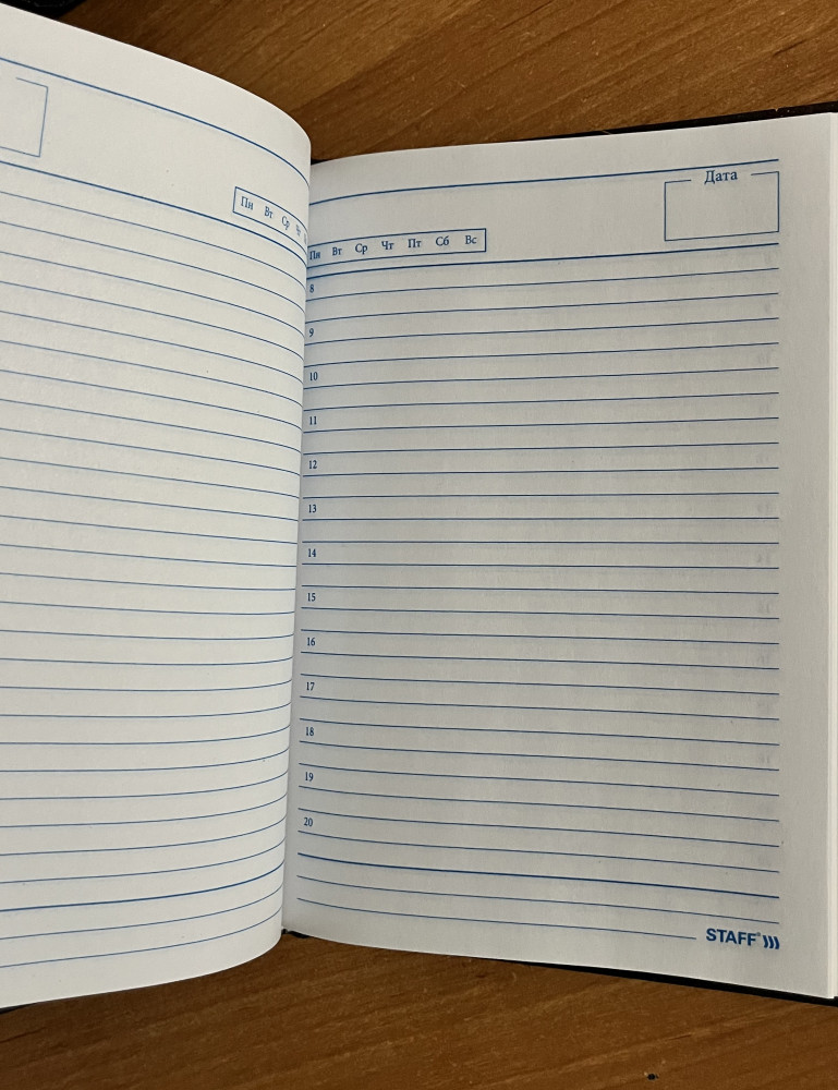 Staff Ежедневник недатированный «Starry»В данный момент этот товар отсутствует в продаже. Возможно, у нас найдется аналогичный или похожий товар здесь. Недатированный ежедневник предназначен для ведения записей. Отсутствие дат делает его уникальным товаром, которым можно начать пользоваться в любое время года. Внутренний блок содержит 128 листов офсетной бумаги плотностью 60 г/м2. Обложка 7БЦ (твердый переплет с матовой пленкой) обеспечивает долгий срок службы. Отличительная особенность — это поля, где можно проставить даты. Они не пропечатаны, поэтому владелец может отводить на каждый день сколько угодно листов и записывать все важные сведения. |