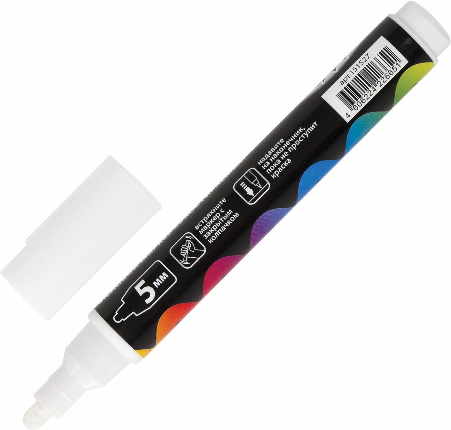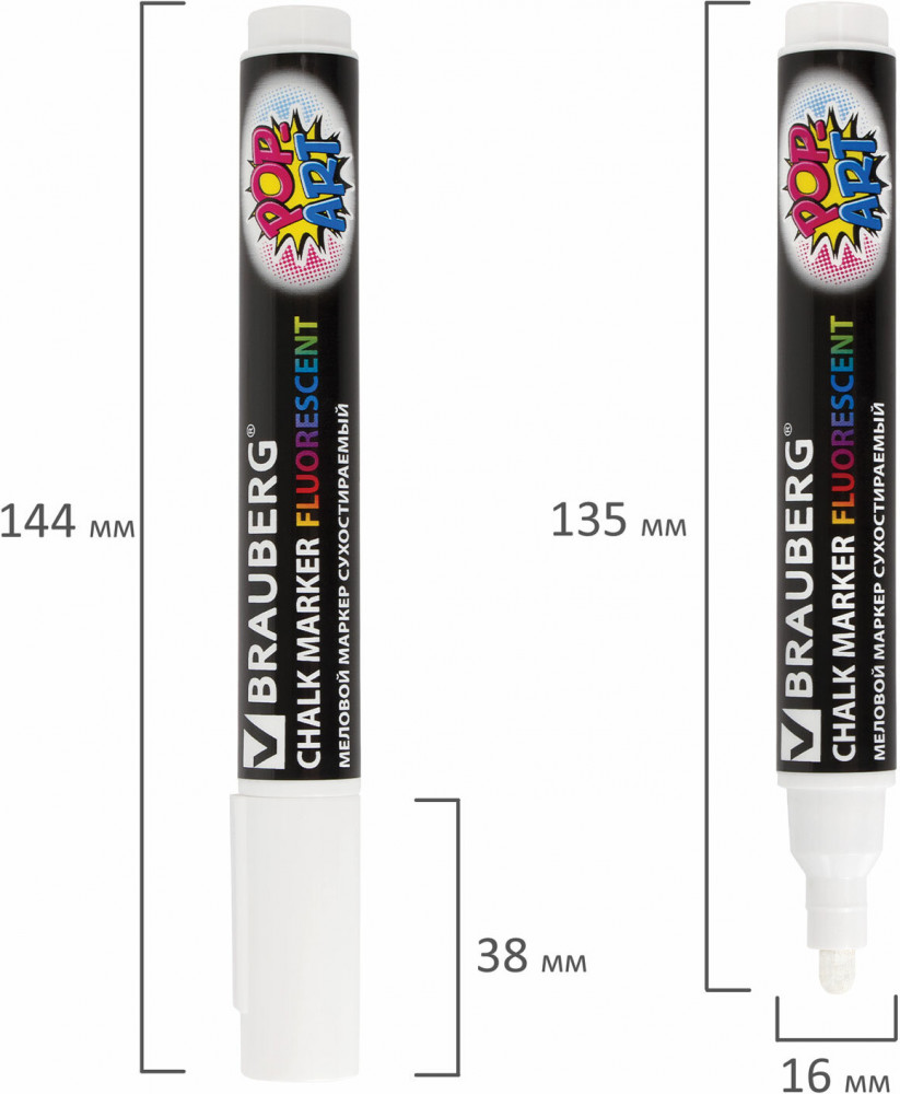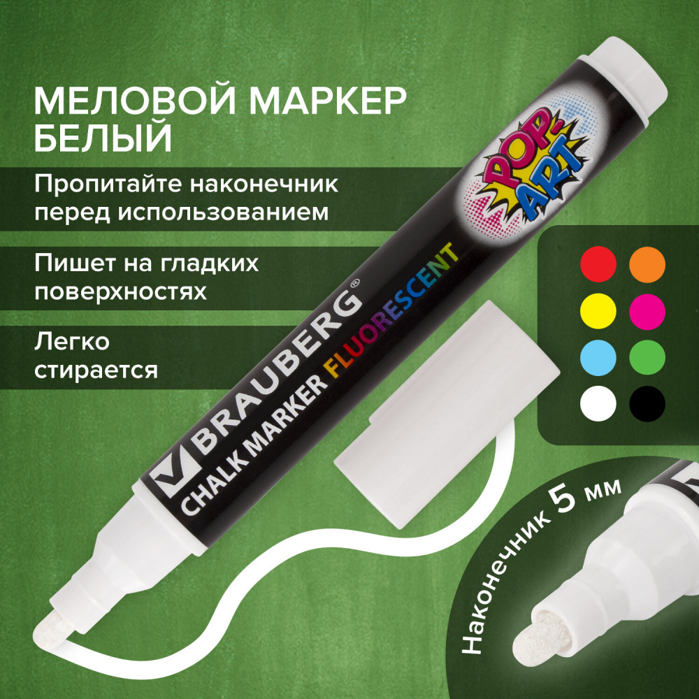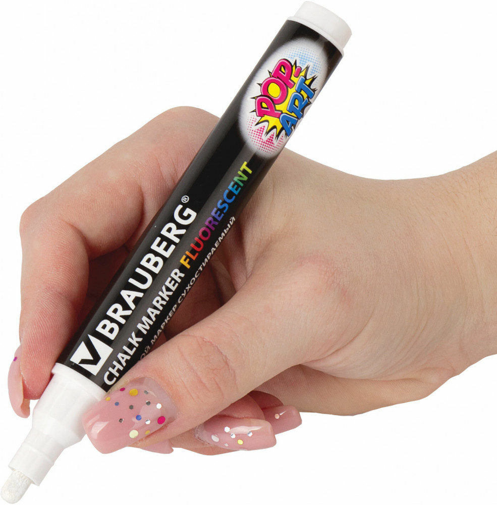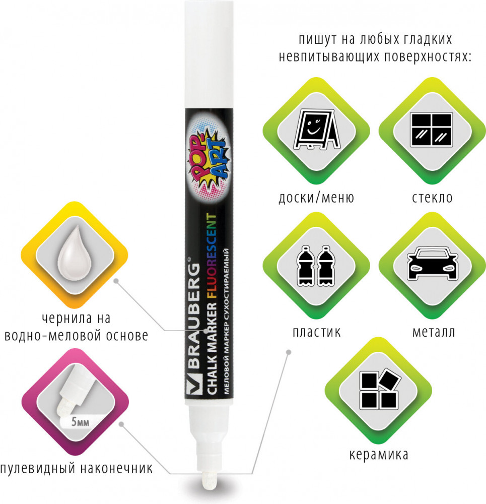 Сухостираемый меловой маркер «Pop-Art» — оригинальный инструмент для оформления различных зон помещений. Идеален для использования на школьных занятиях и детского творчества.