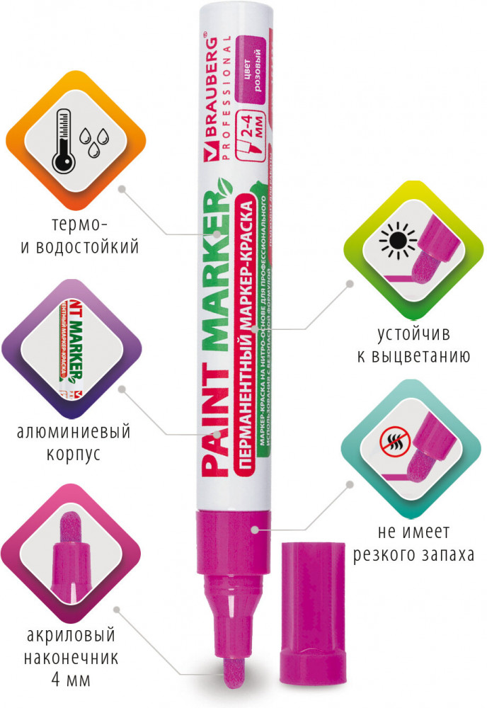 Чернила с лаковым эффектом не содержат ксилол, являясь экологичными и безопасными для окружающей среды. Не имеют резкого запаха нитро-краски в отличие от большинства аналогов, что позволяет использовать данный маркер в закрытых помещениях без вреда для здоровья. Отличаются термо- и водостойкостью, устойчивы к выцветанию. Пишет по сухим, жирным, грязным, ржавым поверхностям. Заправлен высококачественными чернилами с лаковым эффектом. Ширина линии письма составляет 2-4 мм. Прочный круглый наконечник выполнен из пористого акрила. Имеет алюминиевый корпус.