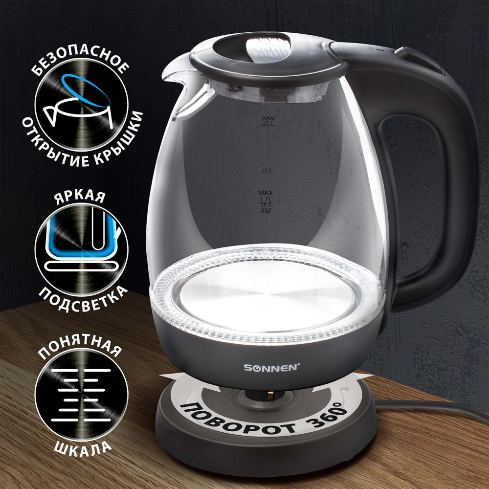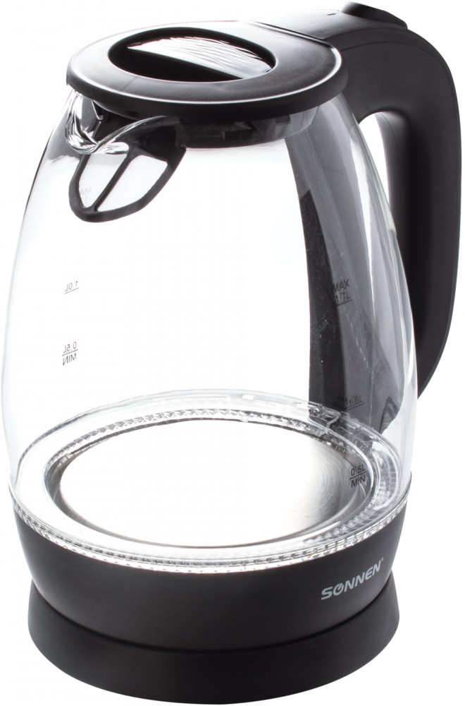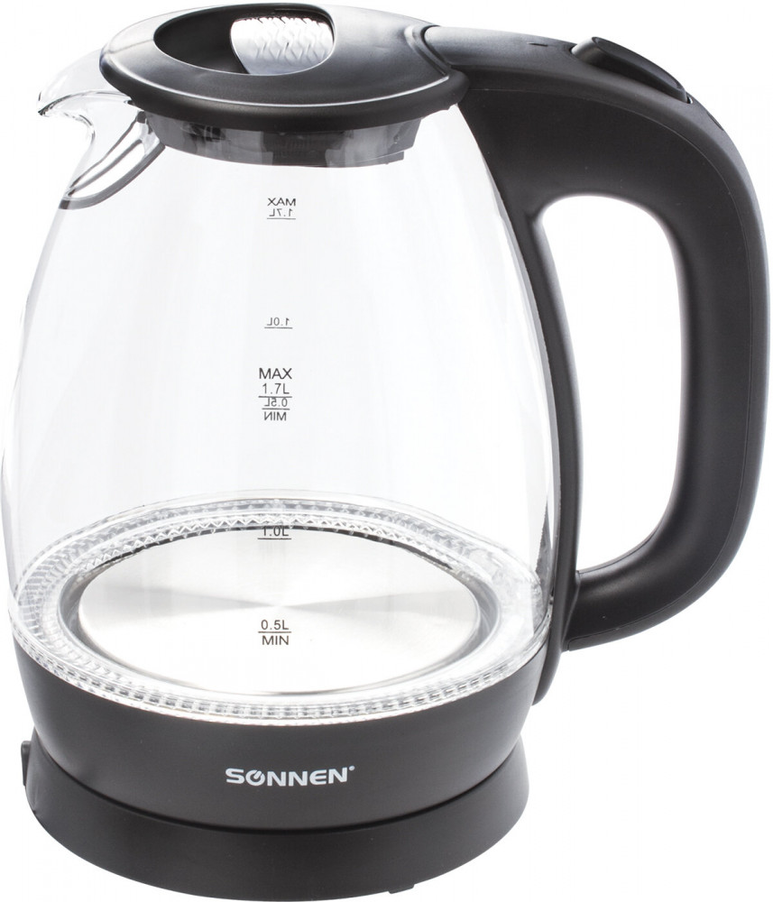 Благодаря своему стильному дизайну, чайник Sonnen KT-1786 отлично впишется в интерьер любой кухни. Корпус чайника изготовлен из закаленного стекла. Чайник Sonnen KT-1786 объемом 1,7 литра и мощностью 2200 Вт поможет вам заварить чай или кофе, быстро вскипятить воду. Индикатор уровня воды позволит с легкостью определить количество воды в чайнике. На ручке чайника находится кнопка открывания крышки, что делает удобнее его эксплуатацию.
