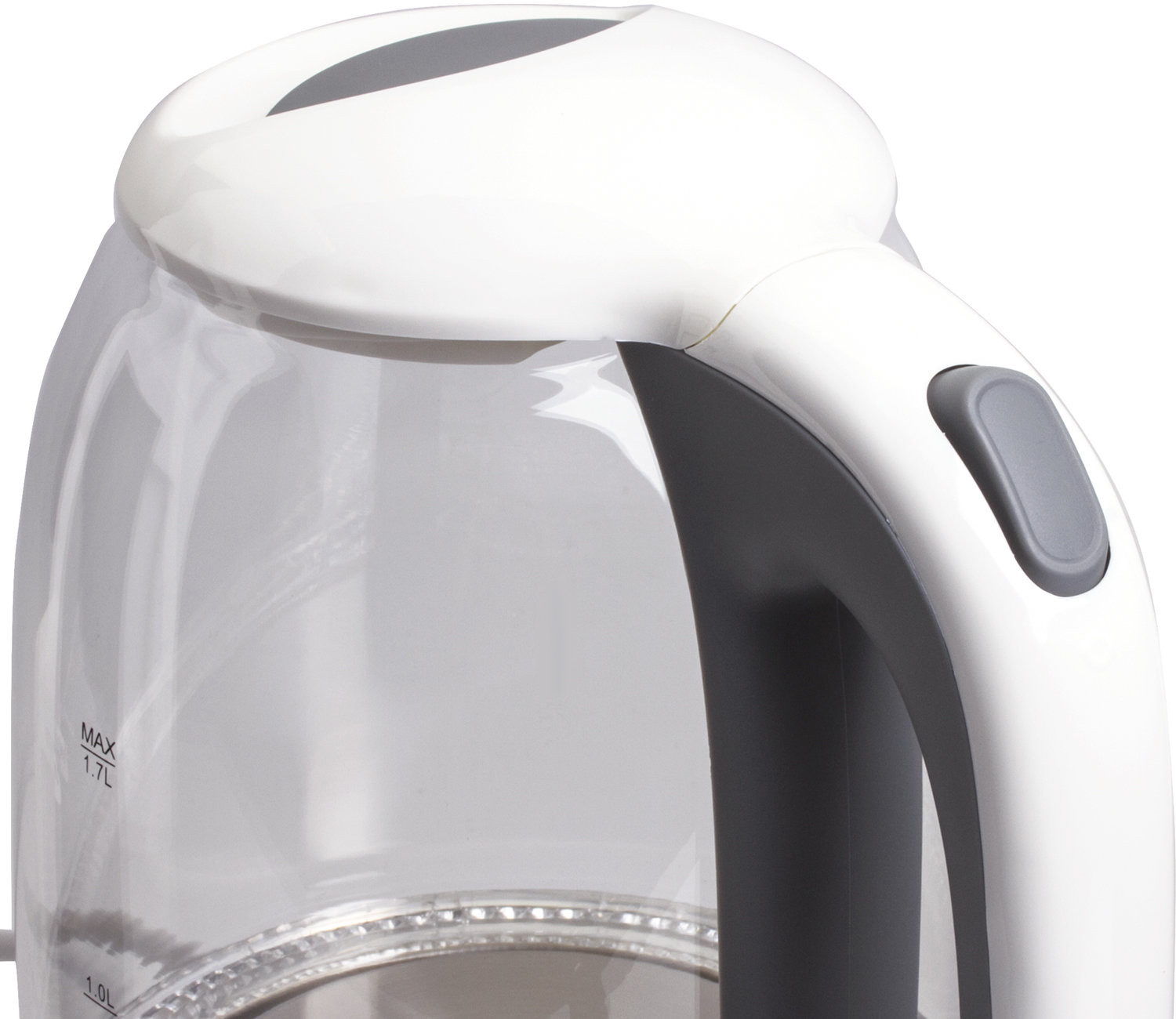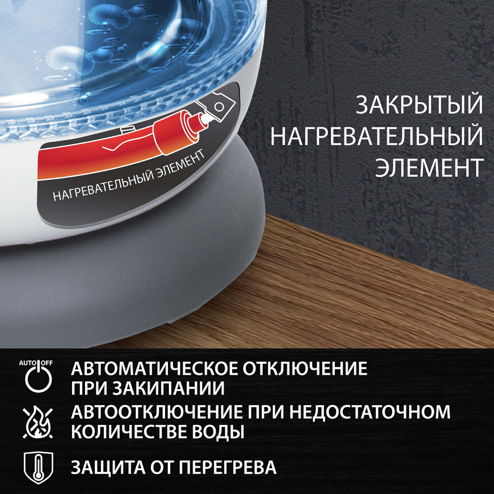 Сменный нейлоновый фильтр предотвратит попадание накипи в напиток. Автоотключение при недостаточном количестве воды и защита от перегрева делают данную модель безопасной в использовании. Дополнительная безопасность достигается с помощью пластиковой вставки на крышке. LED-подсветка проинформирует о том, что чайник включен, и процесс нагрева воды запущен. Шнур, при необходимости, можно спрятать в специальный отсек, расположенный в подставке.