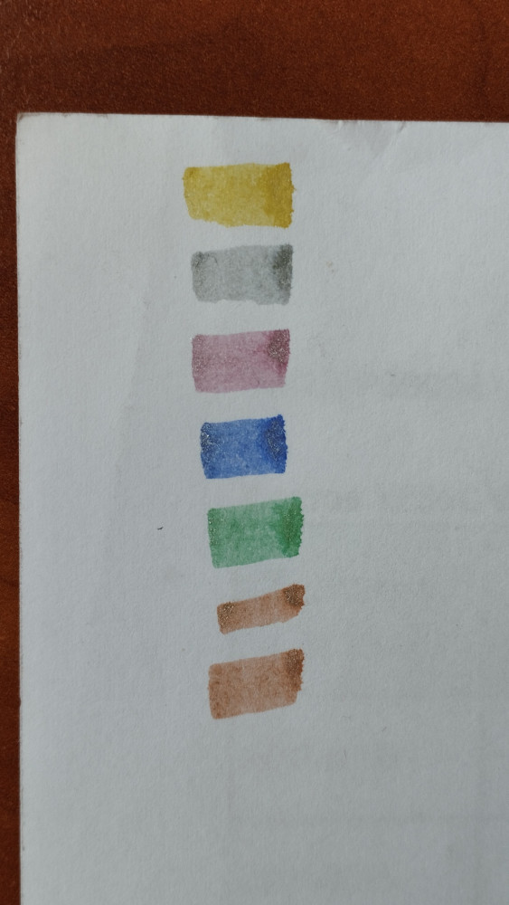 Интересный набор, но блеска или перламутра нет. Имхо, жёлтый цвет на бумаге выглядит как разлитый чай 🥲