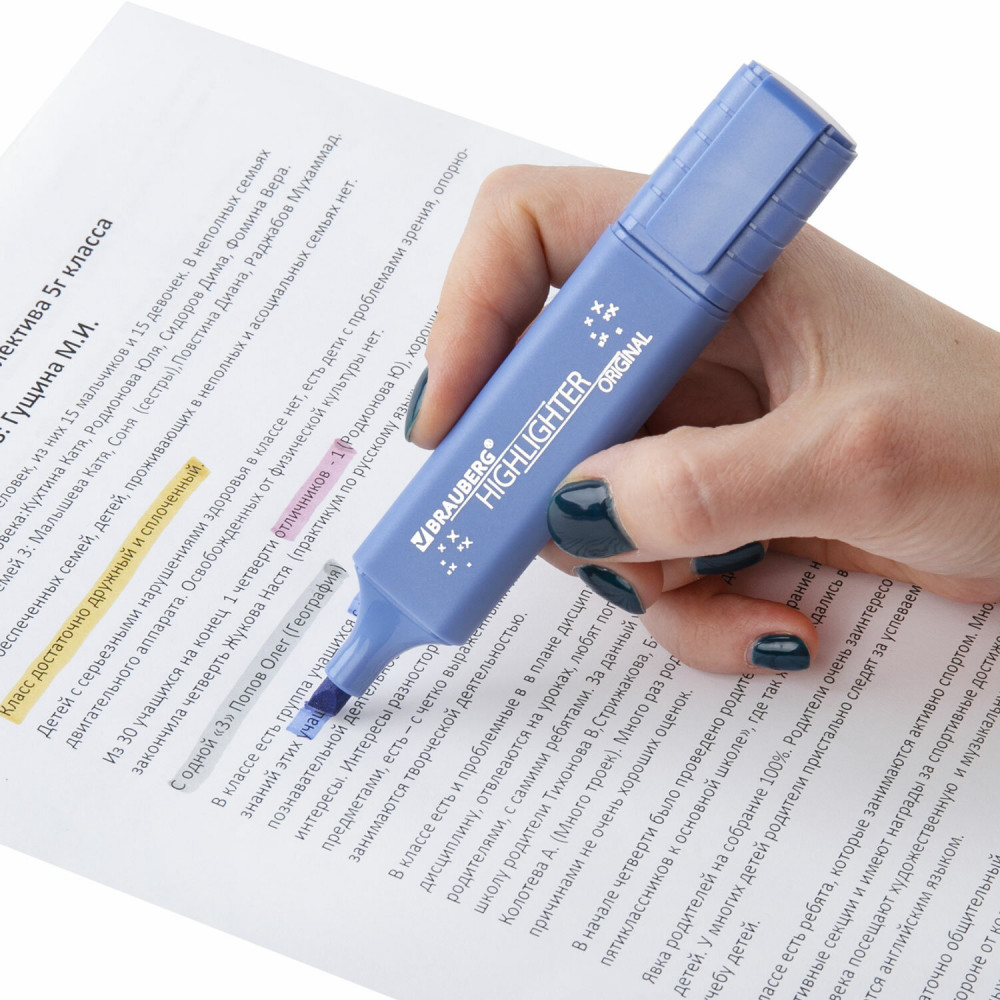 Текстовыделители Brauberg «Original Pearl» предназначены для выделения текста на бумаге любого типа, включая факс-бумагу. Текстовыделители имеют плоскую форму корпуса. Скошенный наконечник имеет толщину линии письма от 1 до 5 мм, что обеспечивает удобство при работе с текстом, напечатанным мелким шрифтом, или таблицами.