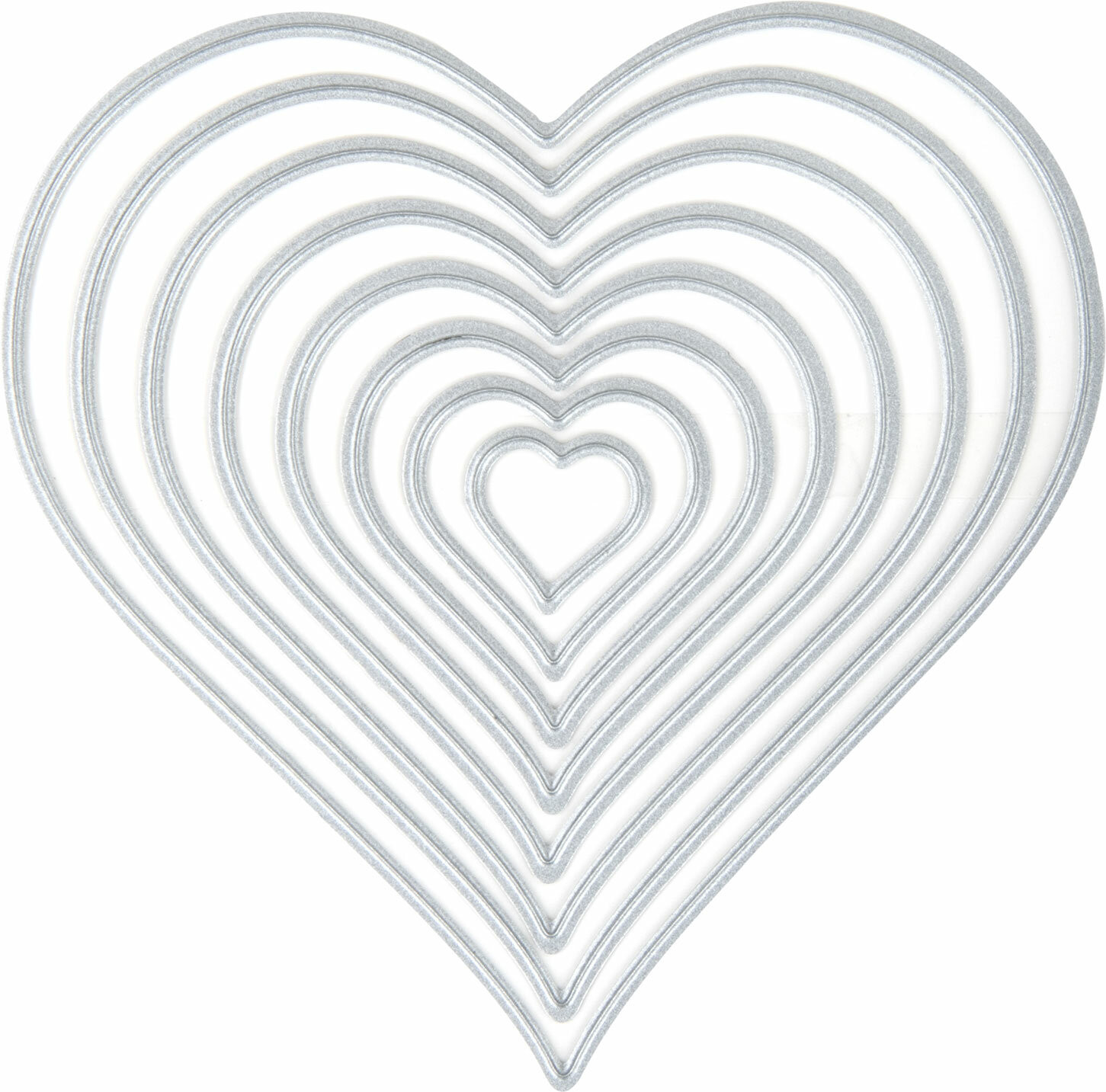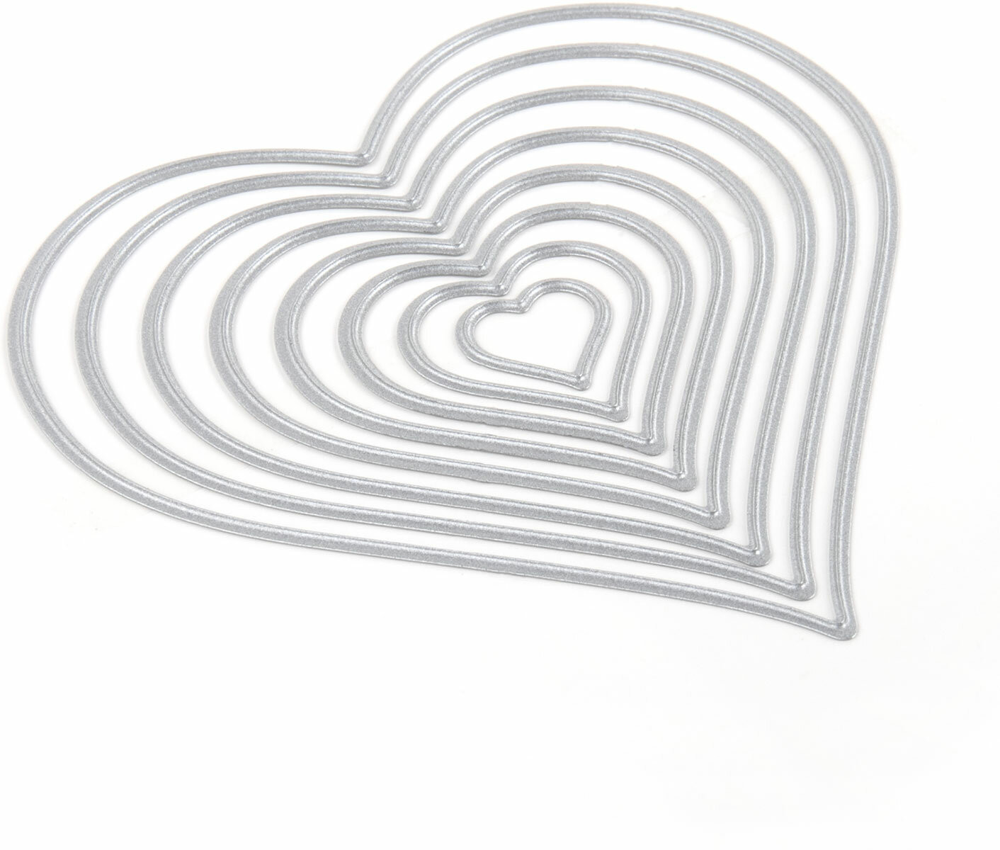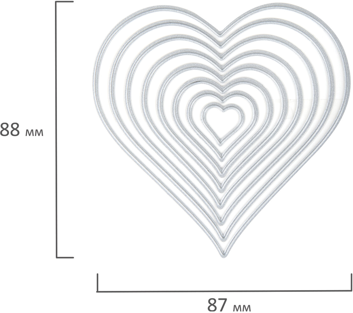 В набор входит 8 стальных ножей в форме сердец, с максимальным размером 87×87 мм. Ножи многофункциональны: каждый из них позволяет создать вырубку и эффект тиснения. Материалы, подходящие для работы — бумага, картон, алюминиевая фольга для рукоделия, фоамиран и другие.
