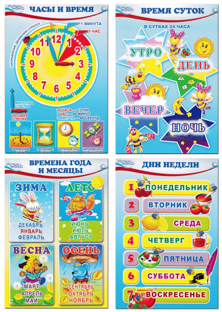 Серия: Познавательные мини-плакаты Комплект «Математика. Ориентировка во времени» адресован детям дошкольного возраста и включает в себя четыре познавательных мини-плаката: «Часы и время», «Дни недели», «Времена года и месяцы», «Части суток». |
