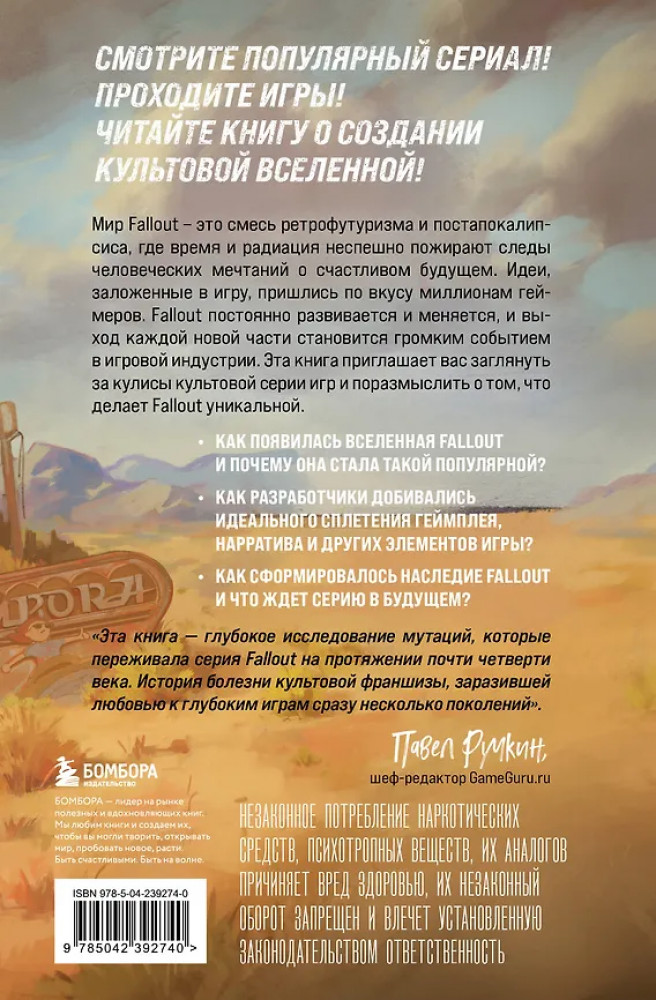 💳 Оплатить за товар можно при получении 🇰🇿 Есть бесплатная доставка по Казахстану от 1 дня 🎁 Копите бонусы с каждой покупки Серия: Легендарные компьютерные игры Мир Fallout — это смесь ретро-футуризма и постапокалипсиса, где время и радиация неспешно пожирают следы человеческих мечтаний о счастливом будущем. Идеи, заложенные в игру, пришлись по вкусу миллионам геймеров. Fallout постоянно развивается и меняется, и выход каждой новой части становится громким событием в игровой индустрии. Эта книга приглашает вас заглянуть за кулисы культовой серии игр и поразмыслить о том, что делает Fallout уникальной. |