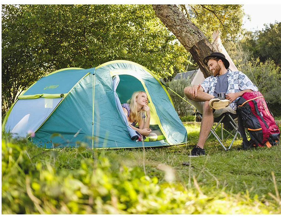 Ткань палатки трехслойный полиэстер. Конструкция прихожей дает дополнительное пространство. Двери, окна защищены от насекомых. Вместимость 4 взрослых. Изделие легкое в сборке. Имеются карманы для мелочей.