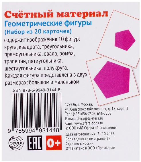 Счетный материал. Набор из 20 карточек. Геометрические фигуры+5