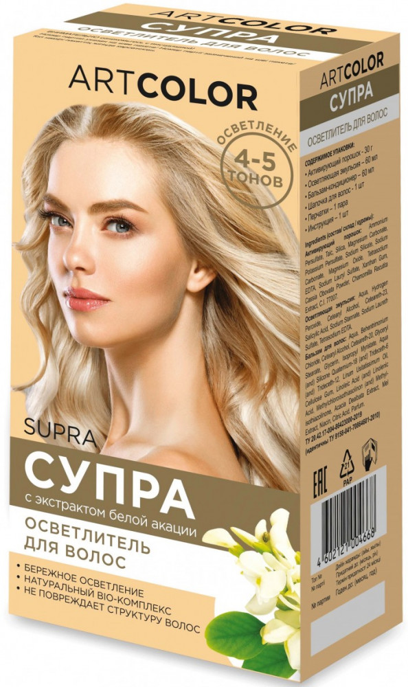 Артколор Осветлитель для волос с экстрактом белой акации «Супра»В данный момент этот товар отсутствует в продаже. Возможно, у нас найдется аналогичный или похожий товар здесь. Артколор Супра мягко и бережно осветляет волосы, легко и равномерно наносится, не стекает с волос, идеально сочетается с оттеночными средствами Артколор и является прекрасной основой для последующего окрашивания. Биокомплекс с экстрактами меда и белой акации проникает вглубь Ваших волос, помогая мягко осветлить их до самых кончиков без «эффекта желтизны». Инновационная формула осветляющей эмульсии усиливает смягчающий эффект, а специальная формула увлажняющего бальзама-кондиционера придает Вашим волосам шелковистость, эластичность и силу, великолепную расчесываемость и здоровое сияние. |