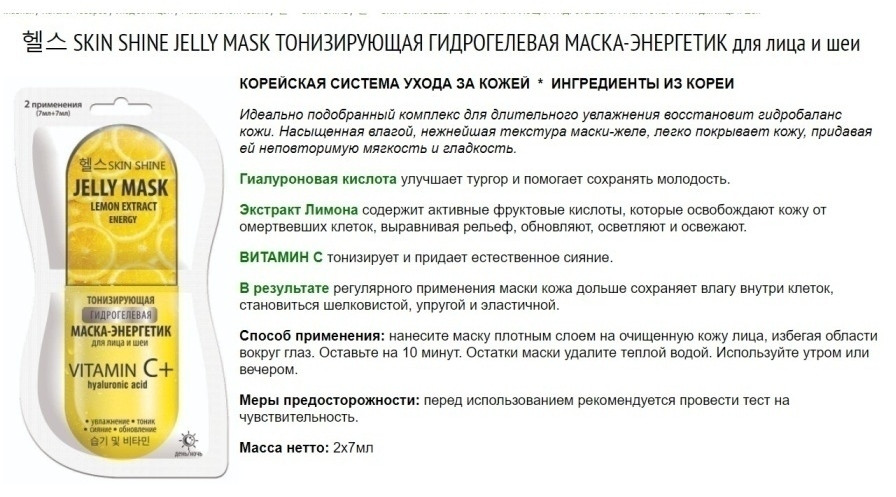 Skin Shine Маска-энергетик для лица и шеи тонизирующаяВ данный момент этот товар отсутствует в продаже. Возможно, у нас найдется аналогичный или похожий товар здесь. Серия: Jelly mask Идеально подобранный комплекс для длительного увлажнения восстановит гидробаланс кожи. Насыщенная влагой, нежнейшая текстура маски-желе, легко покрывает кожу, придавая ей неповторимую мягкость и гладкость. Гиалуроновая кислота улучшает тургор и помогает сохранять молодость. Экстракт Лимона содержит активные фруктовые кислоты, которые освобождают кожу от омертвевших клеток, выравнивая рельеф, обновляют, осветляют и освежают. Витамин С тонизирует и придает естественное сияние. В результате регулярного применения маски кожа дольше сохраняет влагу внутри клеток, становиться шелковистой, упругой и эластичной. |