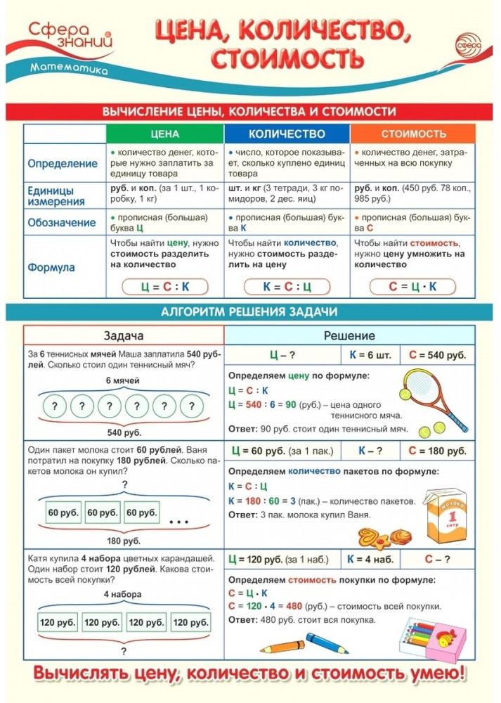 💳 Оплатить за товар можно при получении 🇰🇿 Есть бесплатная доставка по Казахстану от 1 дня 🎁 Копите бонусы с каждой покупки Серия: Сфера знаний Плакат даст представление о понятиях «цена», «количество», «стоимость», алгоритмах их вычисления, познакомит с основными формулами, поможет выработать и закрепить навыки необходимых математических действий. Для удобства каждый текстовой блок проиллюстрирован примерами и выделен соответствующим цветом. |