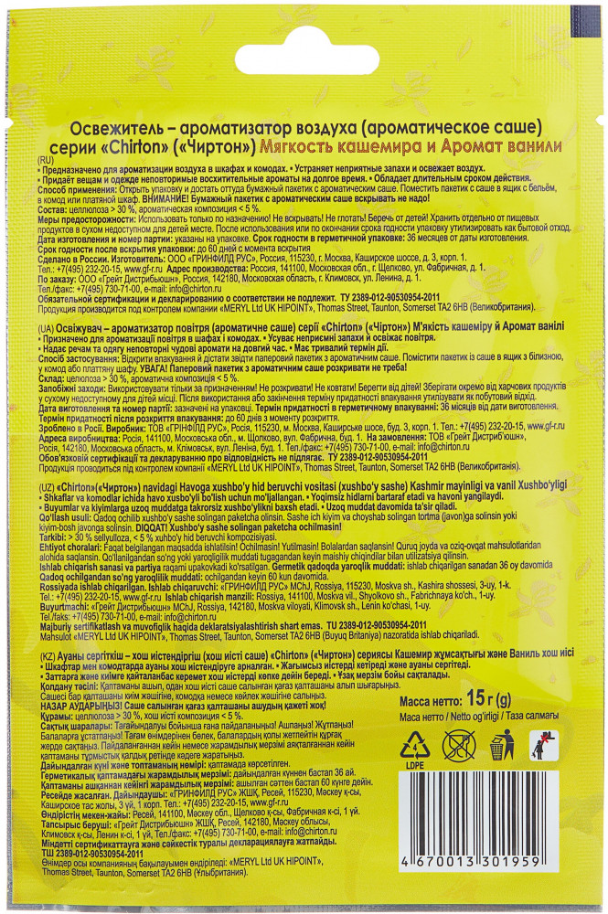 Chirton Саше ароматическое «Мягкость кашемира и ваниль»