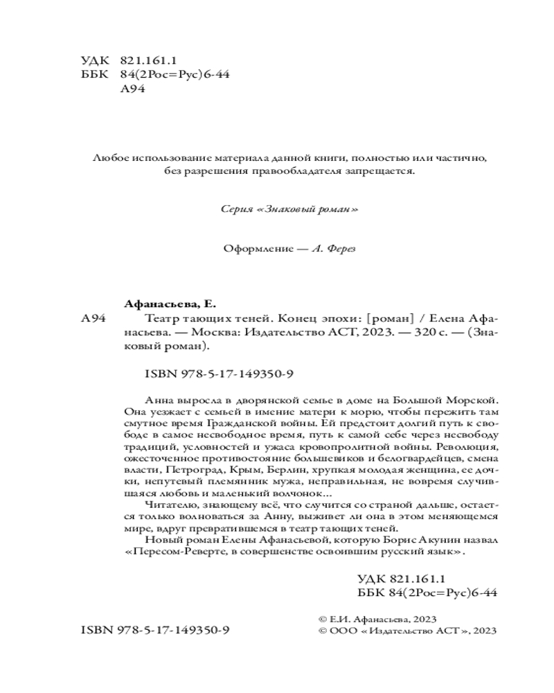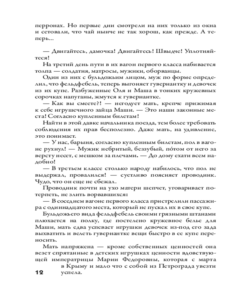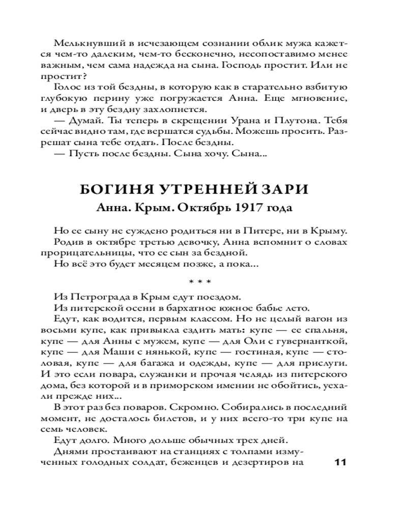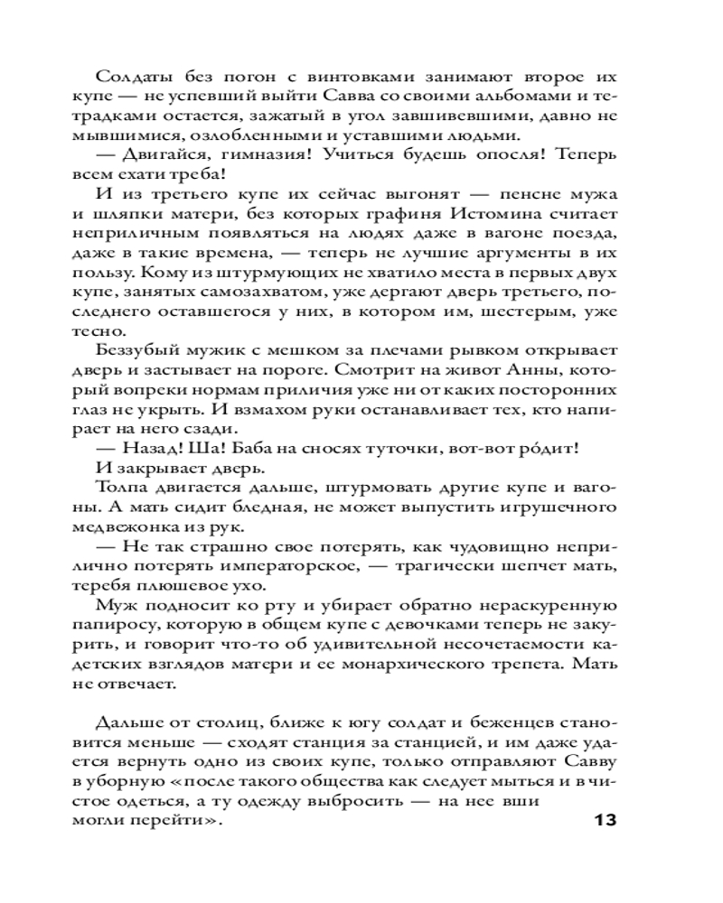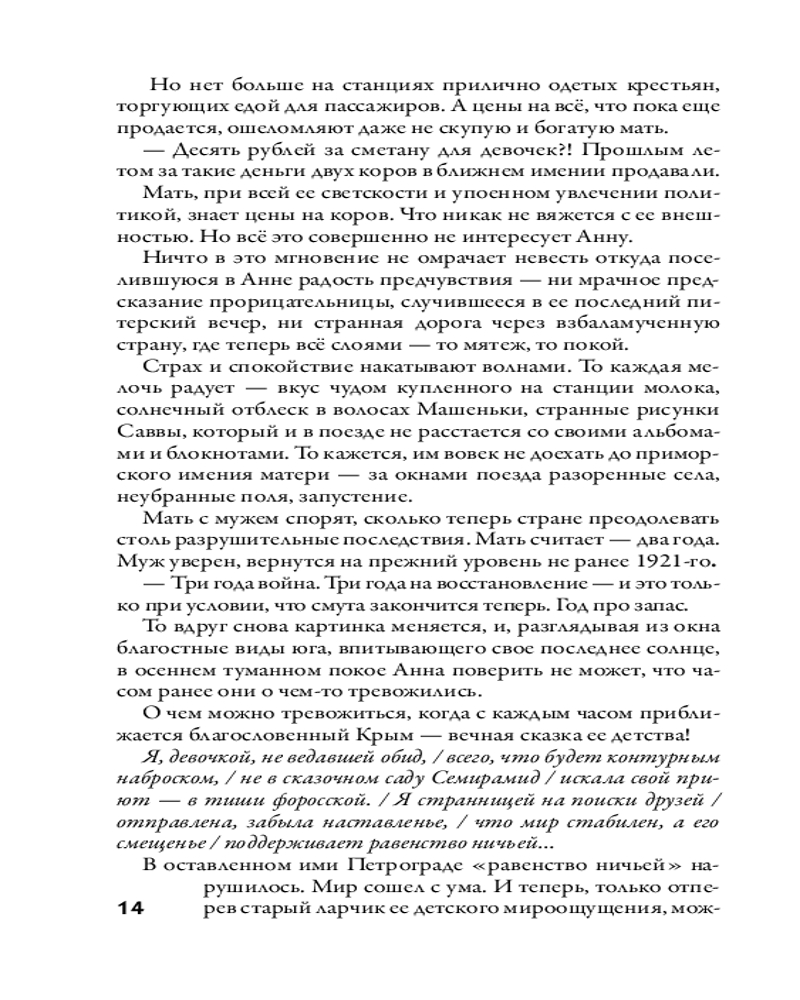 Театр тающих теней. Конец эпохиВ данный момент этот товар отсутствует в продаже. Возможно, у нас найдется аналогичный или похожий товар здесь. Серия: Знаковый роман Анна выросла в дворянской семье в доме на Большой Морской. Она уезжает с семьей в имение матери к морю, чтобы пережить там смутное время Гражданской войны. Ей предстоит долгий путь к свободе в самое несвободное время, путь к самой себе через несвободу традиций, условностей и ужаса кровопролитной войны. Революция, ожесточенное противостояние большевиков и белогвардейцев, смена власти, Петроград, Крым, Берлин, хрупкая молодая женщина, ее дочки, непутевый племянник мужа, неправильная, не вовремя случившаяся любовь и маленький волчонок... |