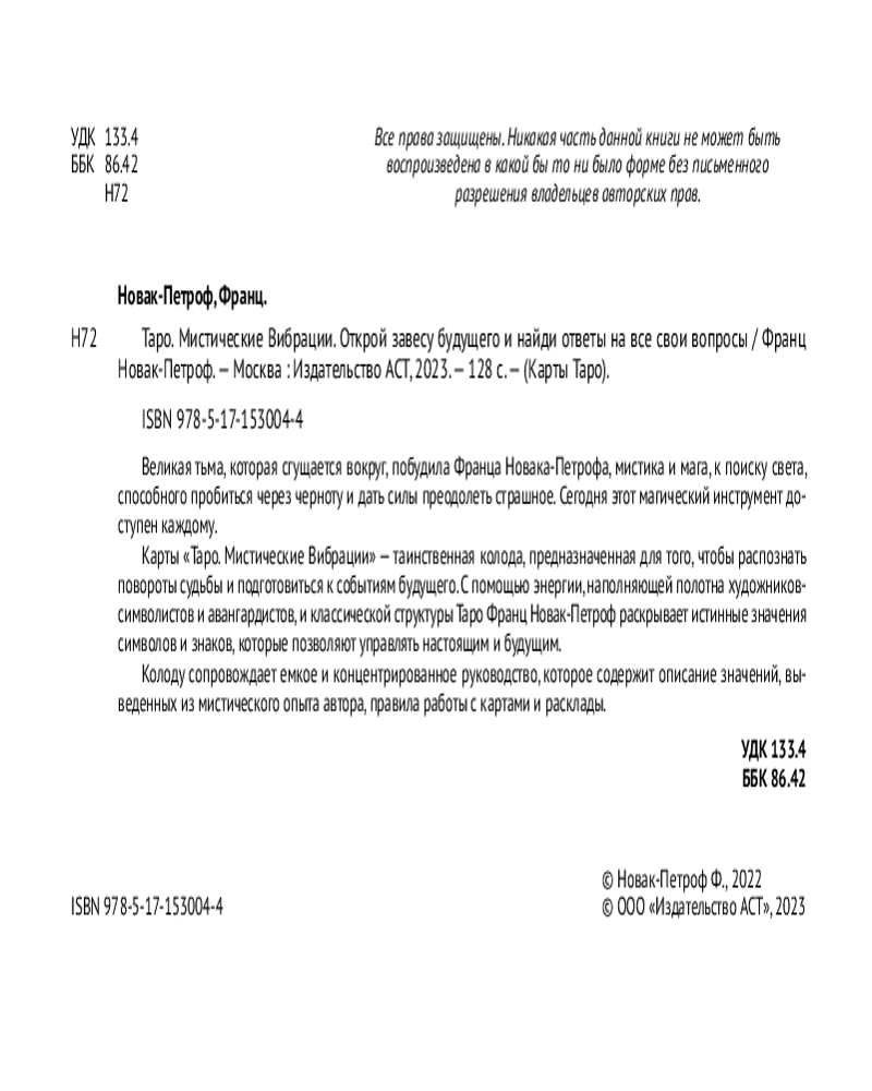 💳 Оплатить за товар можно при получении 🇰🇿 Есть бесплатная доставка по Казахстану от 1 дня 🎁 Копите бонусы с каждой покупки Серия: Карты Таро (Подарочная коробка с картами и книгой) Карты «Таро. Мистические Вибрации» — таинственная колода, предназначенная для того, чтобы распознать повороты судьбы и подготовиться к событиям будущего. С помощью энергии и таланта художников прошлого и классической структуры Таро маг и мистик Франц Новак-Петроф предлагает вам соединить свое бессознательное «я» с символическим описанием прошлого и будущего в полотнах символистов и авангардистов. |