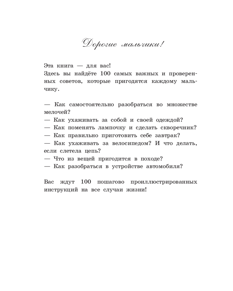 💳 Оплатить за товар можно при получении 🇰🇿 Есть бесплатная доставка по Казахстану от 1 дня 🎁 Копите бонусы с каждой покупки Серия: Самоучитель для детей 100 самых важных и проверенных советов, которые пригодятся каждому мальчику. Как самостоятельно разобраться во множестве мелочей? Как ухаживать за собой и своей одеждой? Как поменять лампочку и сделать скворечник? Как правильно приготовить себе завтрак? Как ухаживать за велосипедом? Что из вещей пригодится в походе? Об этом и многом другом мальчики узнают из этой книги. |