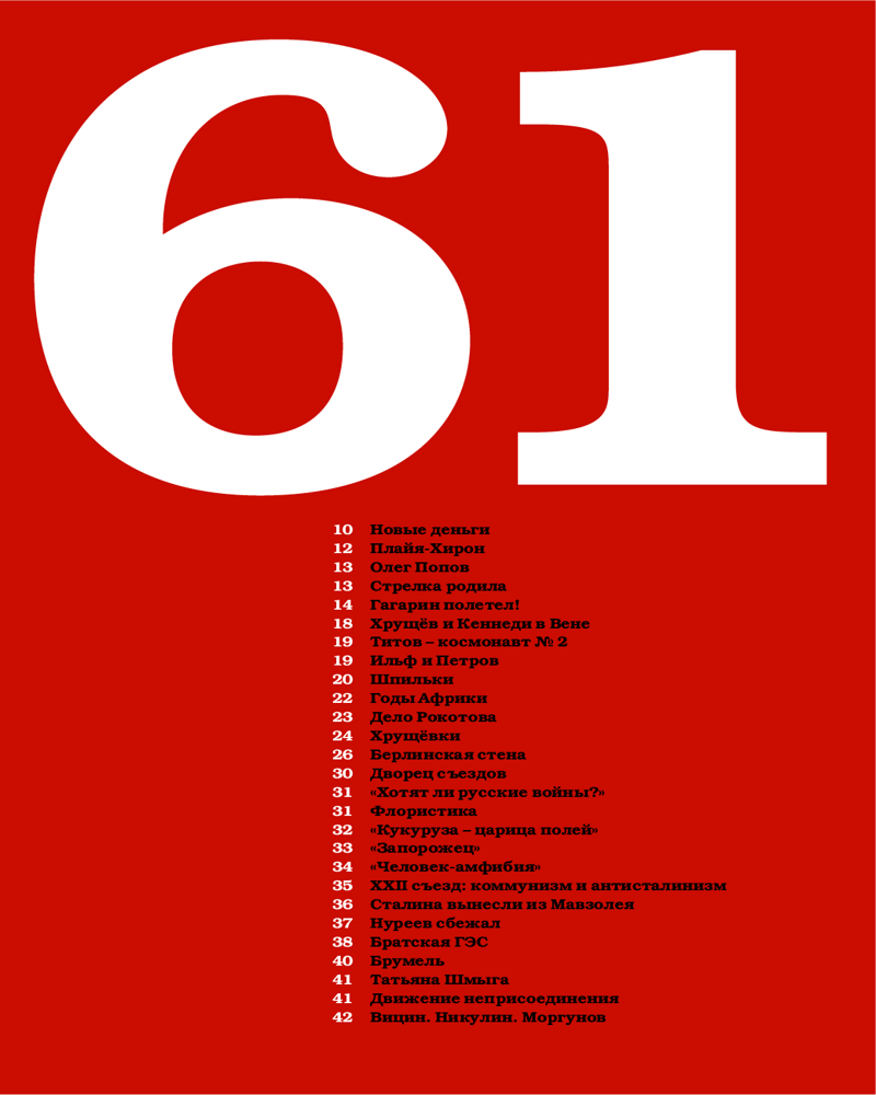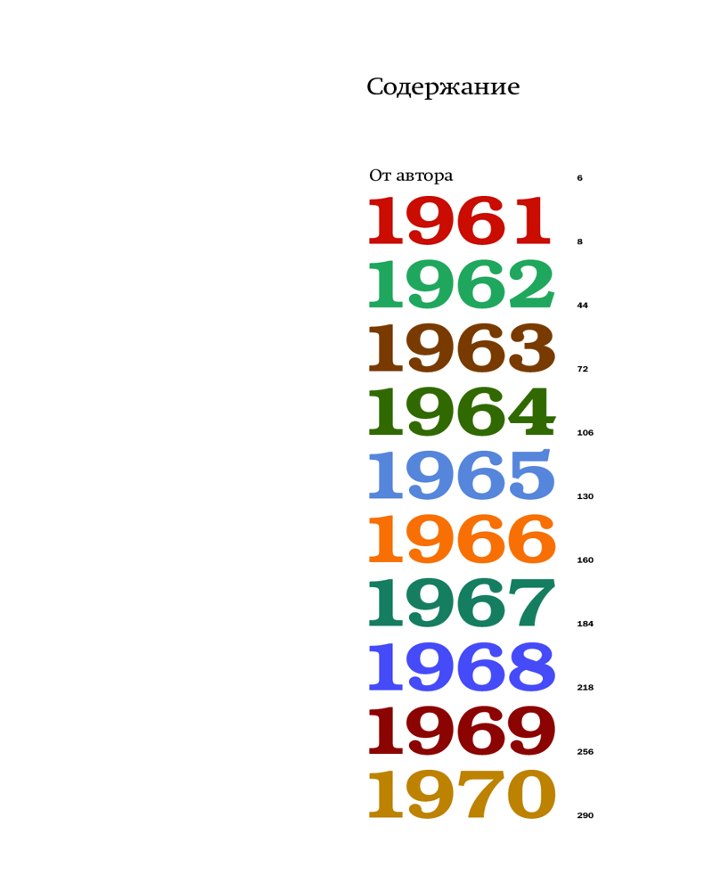 Карибский кризис и КВН, выходной в субботу и вынос Сталина из Мавзолея, квартиры-хрущёвки и «Куба — любовь моя!», Гагарин и Гленн, поручик Ржевский и Пьеха, ушастый «Запорожец» и убийство Кеннеди, прима Плисецкая и песни Пахмутовой, расстрел в Новочеркасске и Роднина, КСП и коммунизм к 1980-му, высылка Бродского и возвращение Стрельцова, Зорге и землетрясение в Ташкенте, твист и Театр на Таганке, Магомаев и МКАД, смещение Хрущёва и самиздат, Берлинская стена и «Бриллиантовая рука», Анжелика и американцы на Луне, стройотряды и Софи Лорен, хулахуп и хунвейбины, бегство Нуриева и Братская ГЭС, плащ-болонья и пенсии колхозникам, Грушинский фестиваль и Генсек Брежнев, Окуджава и «Операция „Ы“», искусственный мех и Индира Ганди, Шестидневная война и шесть соток, «В мире животных» и ввод войск в Чехословакию, Брумель и балет «Спартак», янтарь и «Я шагаю по Москве», Солженицын и «Спидола», мини-юбки и мелиорация, война во Вьетнаме и вратарь Яшин, автобусы «Икарус» и Андропов во главе КГБ, два года в армии и дворцы бракосочетания, студент Шурик и «Спортлото», Чебурашка и чеканка, Олег Попов и Останкино, Даманский и деревенская проза, нейлоновые рубашки и нефтепровод «Дружба», выходной 8 марта и Вицин—Никулин—Моргунов.