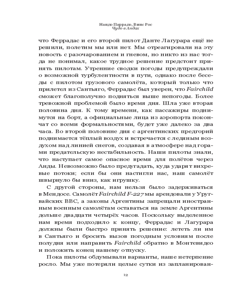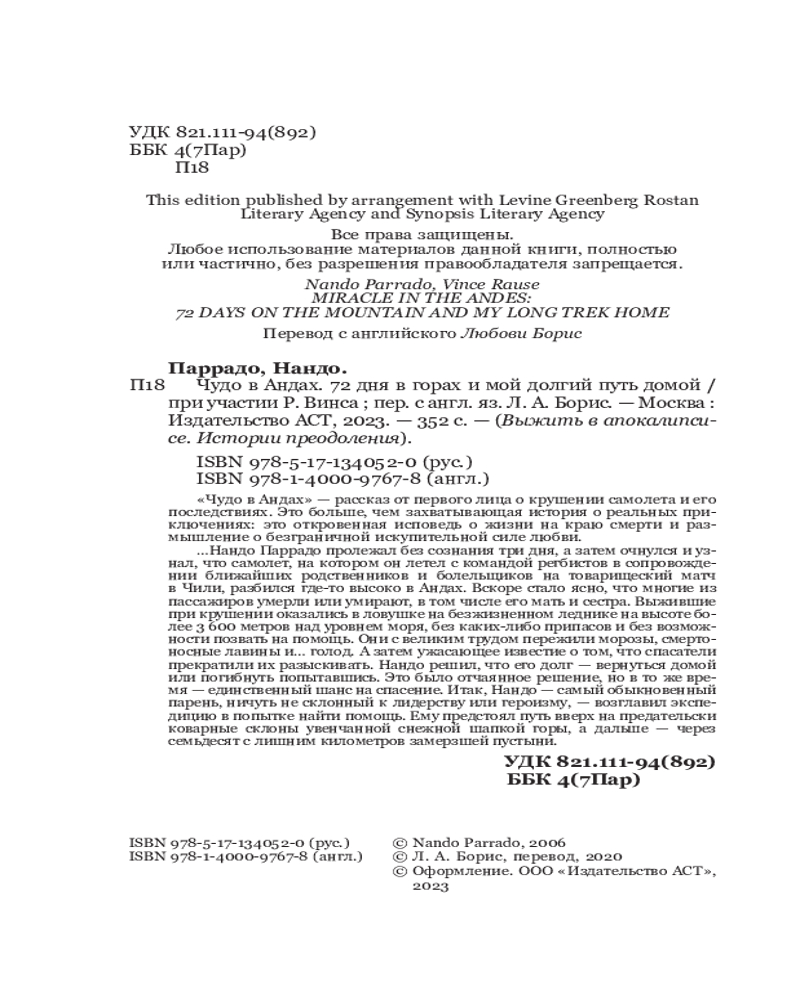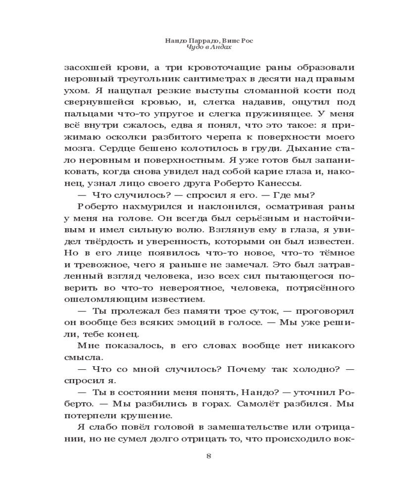 «Чудо в Андах» — поразительное повествование о невообразимом испытании. В прямой, ошеломляюще честной прозе Нандо Паррадо рассказывает читателям, что потребовалось — и каково это оказалось на самом деле, — чтобы выжить высоко в Андах и продержаться целых 72 дня после того, как потерпевших крушение самолета оставили умирать. Стоит вам только взять эту книгу в руки, и вы уже не сможете ее отложить!» — Джон Кракауэр, автор бестселлеров «В диких условиях», «В разреженном воздухе», «Под знаменем небес» и др.