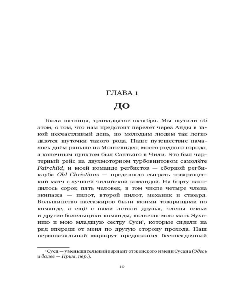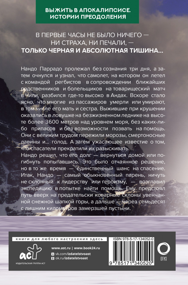 В данный момент этот товар отсутствует в продаже. Возможно, у нас найдется аналогичный или похожий товар здесь. Серия: Выжить в апокалипсисе. Истории преодоления Нандо Паррадо пролежал без сознания три дня, а затем очнулся и узнал, что самолет, на котором он летел с командой регбистов в сопровождении ближайших родственников и болельщиков на товарищеский матч в Чили, разбился где-то высоко в Андах. Вскоре стало ясно, что многие из пассажиров умерли или умирают, в том числе его мать и сестра. Выжившие при крушении оказались в ловушке на безжизненном леднике на высоте более 3 600 метров над уровнем моря, без каких-либо припасов и без возможности позвать на помощь. Они с великим трудом пережили морозы, смертоносные лавины и... голод. А затем ужасающее известие о том, что спасатели прекратили их разыскивать.