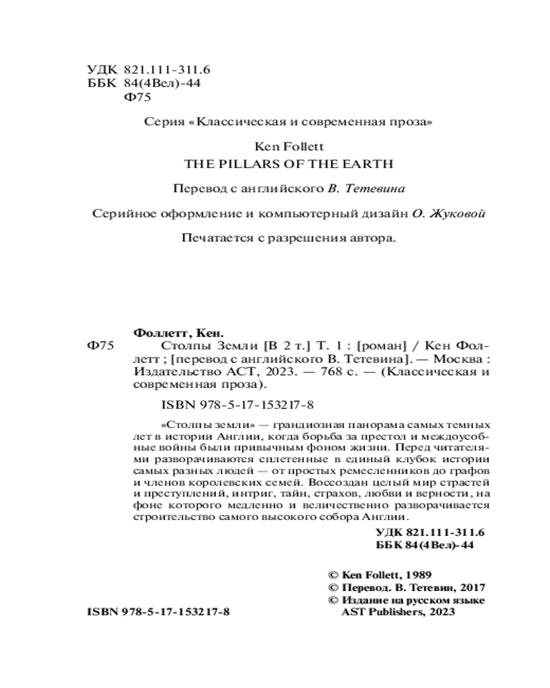 💳 Оплатить за товар можно при получении 🇰🇿 Есть бесплатная доставка по Казахстану от 1 дня 🎁 Копите бонусы с каждой покупки Серия: Классическая и современная проза (нов) «Столпы земли» — грандиозная панорама самых темных лет в истории Англии, когда борьба за престол и междоусобные войны были привычным фоном жизни. Перед читателем раскрываются сплетенные в единый клубок истории самых разных людей — от простых ремесленников до графов и членов королевских семей. Воссоздан целый мир страстей и преступлений, интриг, тайн, страхов, любви и верности, на фоне которого медленно и величественно разворачивается строительство самого высокого собора Англии. |