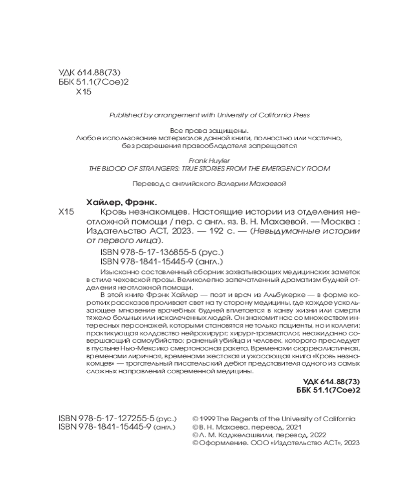 Серия: Невыдуманные истории от первого лица Фрэнк Хайлер — врач отделения неотложной помощи в Альбукерке, Нью-Мексико, и автор книг «Кровь незнакомцев», «Законы невидимых вещей» и «Право жажды». Его произведения появлялись в Atlantic, The Georgia Review, Poetry и во многих других изданиях. |