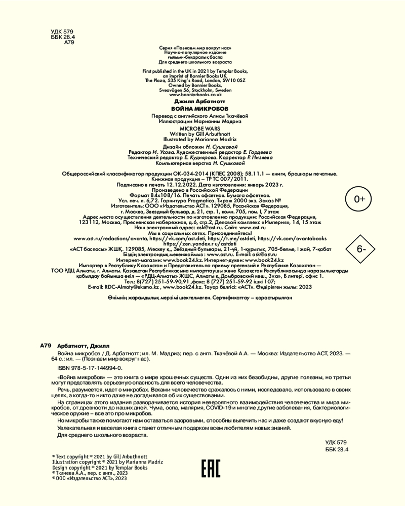 💳 Оплатить за товар можно при получении 🇰🇿 Есть бесплатная доставка по Казахстану от 1 дня 🎁 Копите бонусы с каждой покупки Серия: Познаем мир вокруг нас «Война микробов» — это книга о мире крошечных существ. Одни из них безобидны, другие полезны, но третьи могут представлять серьезную опасность для всего человечества. |