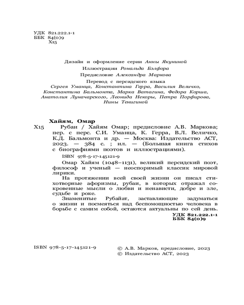 В данный момент этот товар отсутствует в продаже. Возможно, у нас найдется аналогичный или похожий товар здесь. Серия: Большая книга стихов с биографиями поэтов и иллюстрациями Омар Хайям (1048–1131), великий персидский поэт, философ и ученый — неоспоримый классик мировой лирики.