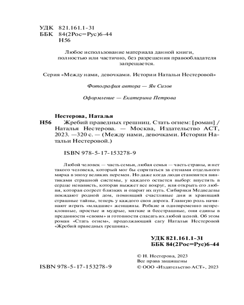 💳 Оплатить за товар можно при получении 🇰🇿 Есть бесплатная доставка по Казахстану от 1 дня 🎁 Копите бонусы с каждой покупки Серия: Между нами, девочками. Истории Натальи Нестеровой Любой человек — часть семьи, любая семья — часть страны, и нет такого человека, который мог бы спрятаться за стенами отдельного мирка в эпоху великих перемен. Но даже когда люди становятся винтиками страшной системы, у каждого остается выбор: впустить в сердце ненависть, которая выжжет все вокруг, или открыть его любви, которая согреет близких и озарит их путь. Сибиряки Медведевы покидают родной дом, помнящий счастливые дни и хранящий страшные тайны, теперь у каждого своя дорога. Главную роль начинают играть «младшие» женщины. Робкие и одновременно непреклонные, простые и мудрые, мягкие и бесстрашные, они едины в преданности «своим» и готовности спасать их любой ценой. Об этом роман «Стать огнем», продолжающий сагу Натальи Нестеровой «Жребий праведных грешниц». |