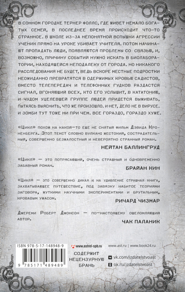 💳 Оплатить за товар можно при получении 🇰🇿 Есть бесплатная доставка по Казахстану от 1 дня 🎁 Копите бонусы с каждой покупки Серия: Мастера ужасов В сонном городке Тернер Фоллс, где живет немало богатых семей, в последнее время происходит что-то странное. В школе из-за непонятной вспышки агрессии ученик прямо на уроке убивает учителя. Потом начинают пропадать люди, появляются проблемы со связью, и, возможно, причину событий нужно искать в биолаборатории, находящейся неподалеку от города. Но никакого расследования не будет, ведь вскоре местные подростки неожиданно превратятся в одержимых кровью садистов, вместо телепередач и телефонных гудков раздастся сигнал, вгоняющий всех, кто его услышит, в кататонию, и чудом уцелевшей группе людей придется выживать, пытаясь выяснить, что же произошло. И нет, дело не в вирусе. И зомби тут тоже ни при чем. Все гораздо, гораздо хуже. |
