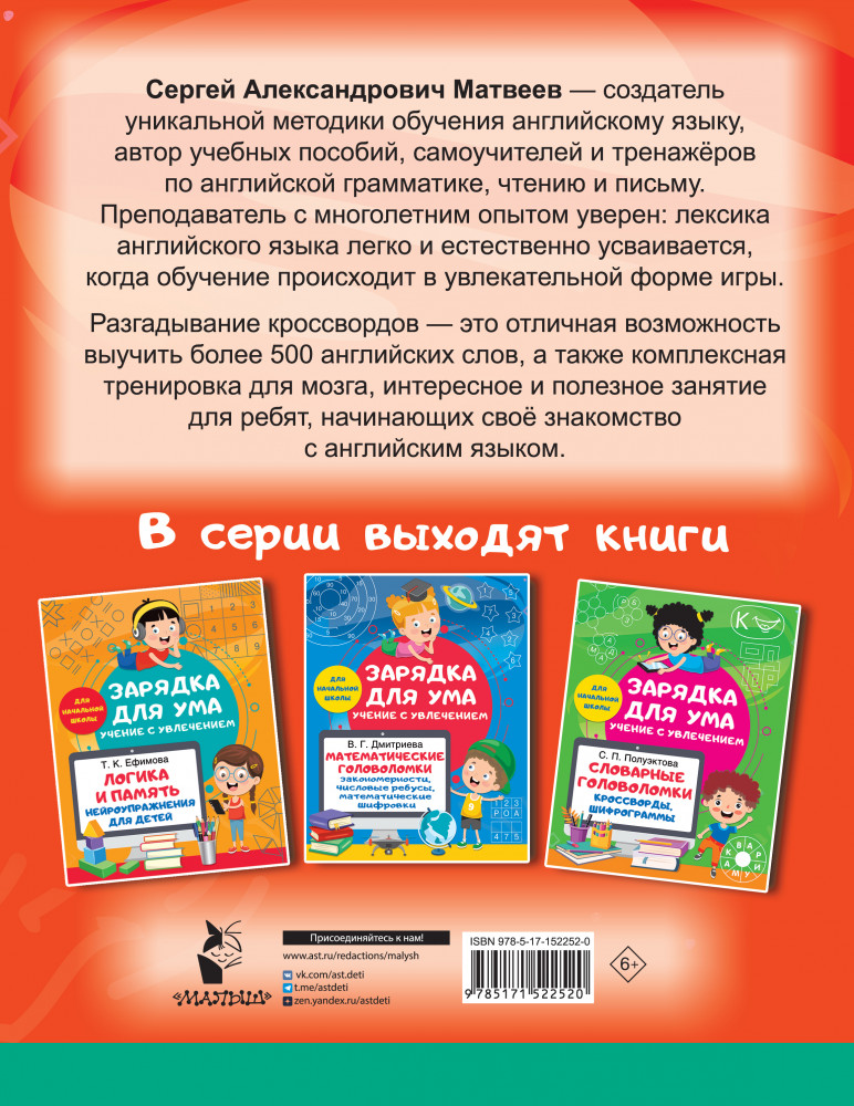 💳 Оплатить за товар можно при получении 🇰🇿 Есть бесплатная доставка по Казахстану от 1 дня 🎁 Копите бонусы с каждой покупки Серия: Зарядка для ума: учение с увлечением «Кроссворды по английскому языку для начальной школы» — это развивающее пособие для учеников 1–4-го классов, основанное на авторской методике А.С. Матвеева. Развивающие кроссворды — отличная возможность выучить более 500 английских слов. Ребёнок тренируется вписывать ответы в нужные клеточки, заполняя пропуски и собирая из букв слова и фразы, — такие интеллектуальные занятия развивают познавательный интерес к английскому языку, внимание, мышление, память, а также способствуют обогащению словарного запаса и позволяют приобрести начальные навыки самостоятельного чтения на английском языке. Разгадывать кроссворды можно на уроках английского языка, на внеклассных занятиях или дома. |