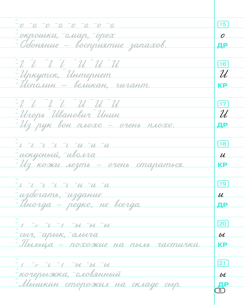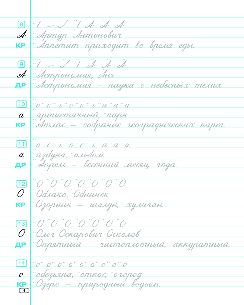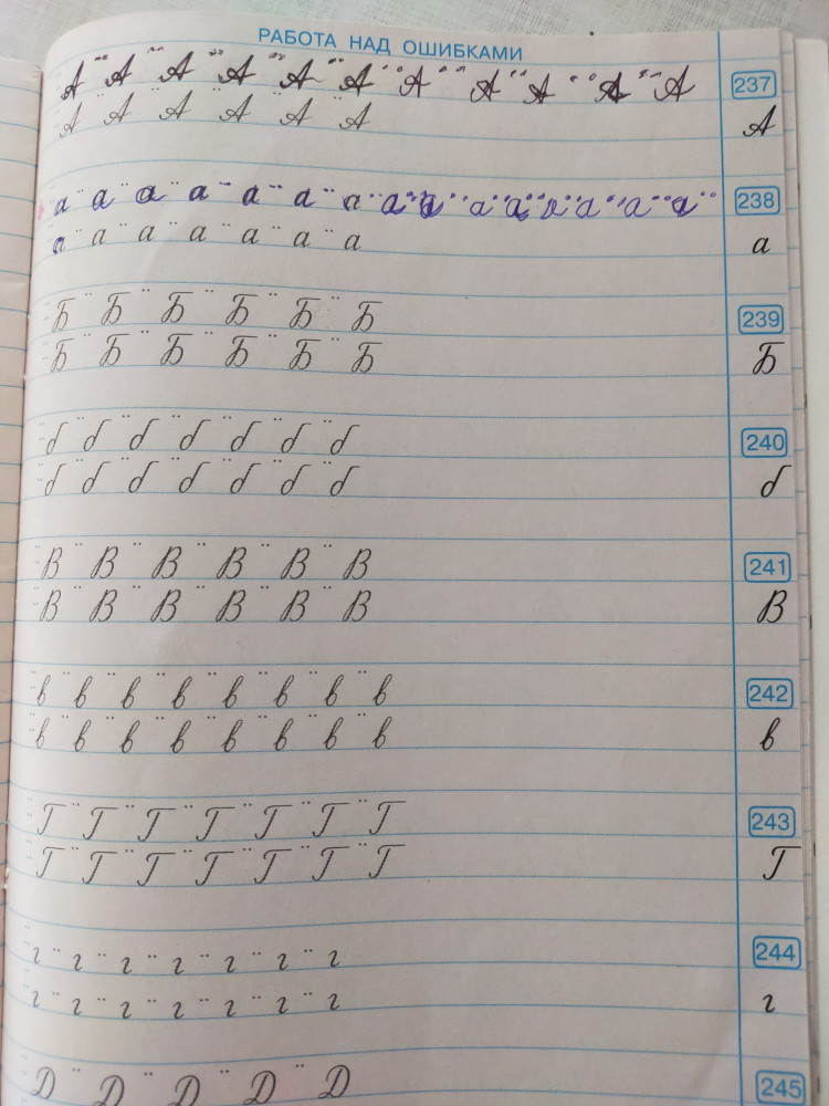 Тренажёр заказали третьекласснику для отработки письма в широкую линию. Первые задания предполагают обводку элементов букв, в дальнейшем на каждую букву даётся по 4 задания, каждое из которых включает работу с элементами, обводку и прописывание слов и обводку предложения. В конце пособия есть примеры соединения букв и строчки для работы над ошибками. Хотелось бы больше места в самой тетради для прописывания заданий. Ребенок сильно давит на ручку, иногда бумага рвется