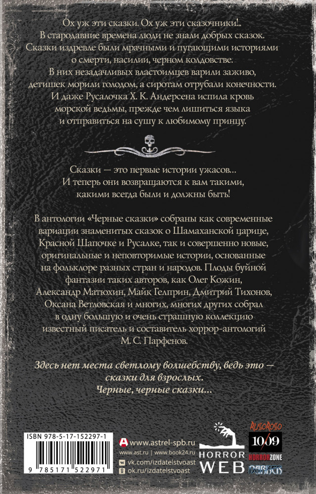 В антологии «Черные сказки» собраны как современные вариации знаменитых сказок о Шамаханской царице, Красной Шапочке и Русалке, так и совершенно новые, оригинальные и неповторимые истории, основанные на фольклоре разных стран и народов. Плоды буйной фантазии таких авторов, как Олег Кожин, Александр Матюхин, Майк Гелприн, Дмитрий Тихонов, Оксана Ветловская и многих, многих других собрал в одну большую и очень страшную коллекцию известный писатель и составитель хоррор-антологий М. С. Парфенов.