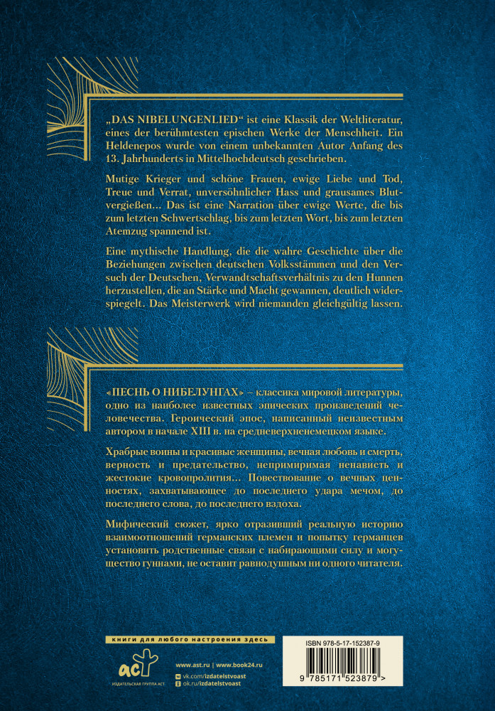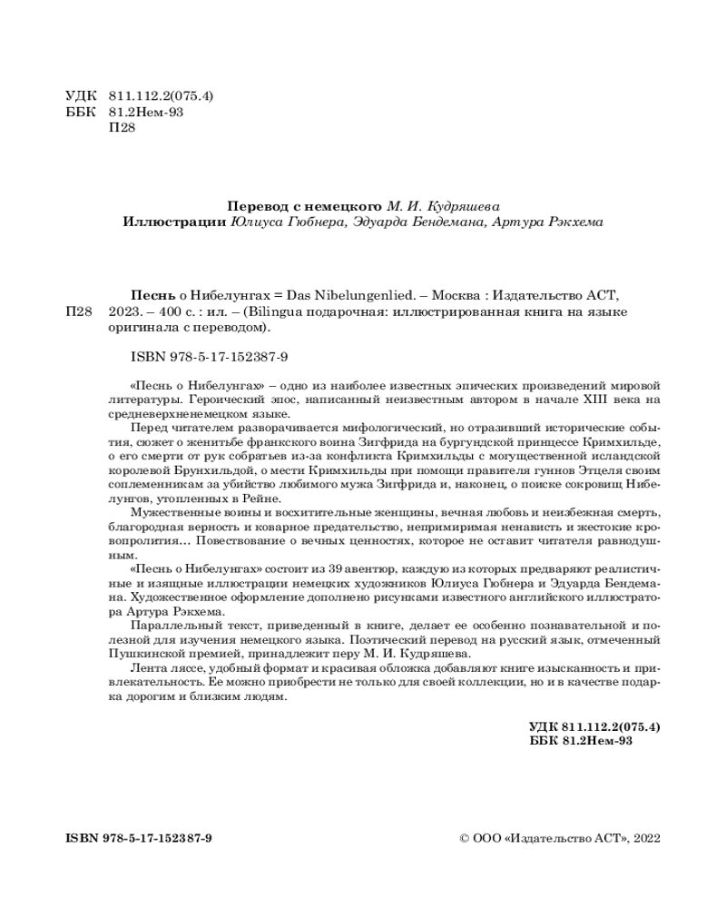 В данный момент этот товар отсутствует в продаже. Возможно, у нас найдется аналогичный или похожий товар здесь. Серия: Bilingua подарочная: иллюстрированная книга на языке оригинала с переводом «Песнь о Нибелунгах» — одно из наиболее известных эпических произведений мировой литературы. Героический эпос, написанный неизвестным автором в начале XIII века на средневерхненемецком языке.