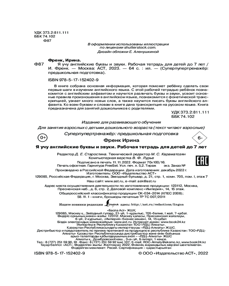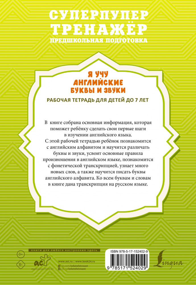 💳 Оплатить за товар можно при получении 🇰🇿 Есть бесплатная доставка по Казахстану от 1 дня 🎁 Копите бонусы с каждой покупки Серия: Суперпупертренажёр: предшкольная подготовка В книге собрана основная информация, которая поможет ребёнку сделать свои первые шаги в изучении английского языка. С этой рабочей тетрадью ребёнок познакомится с английским алфавитом и научится различать буквы и звуки, усвоит основные правила произношения в английском языке, познакомится с фонетической транскрипцией, узнает много новых слов, а также научится писать буквы английского алфавита. Ко всем буквам и словам в книге дана транскрипция на русском языке. Книга предназачена для занятий дошкольников с родителями. |