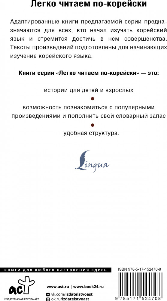 💳 Оплатить за товар можно при получении 🇰🇿 Есть бесплатная доставка по Казахстану 🎁 Копите бонусы с каждой покупки Серия: Легко читаем по-корейски Учебное пособие по домашнему чтению «Самые известные корейские легенды» предназначено для тех, кто изучает корейский язык. Оно включает адаптированные народные сказки, исторические легенды и забавные истории («Брат тигр», «Сорока, тигр и заяц», «Сестра лиса»). Это пособие продолжает серию учебных материалов, в основу которых положены произведения устного народного творчества. |