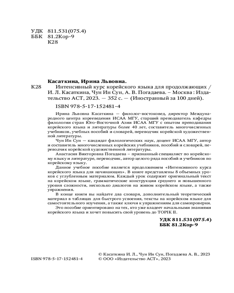 Серия: Иностранный за 100 дней Ирина Львовна Касаткина — филолог-востоковед, директор Международного центра корееведения ИСАА МГУ, старший преподаватель кафедры филологии стран Юго-Восточной Азии ИСАА МГУ с опытом преподавания корейского языка и литературы более 40 лет, составитель многочисленных учебников, учебных пособий и словарей, переводчик корейской художественной литературы.